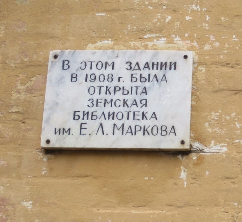 В 1903 году брат писателя, Николай Львович, предложил построить для библиотеки каменное здание с обсерваторией за свой счет, но возникли сложности с выбором подходящего участка. В 1907 году Н.Л. Марков построил здание для библиотеки им. Е.Л. Маркова, но отказался передать его городу. В 1908 году земское собрание решило открыть земскую библиотеку им. Е.Л. Маркова на земские средства, предложив Н.Л. Маркову передать здание земству, на что он согласился.