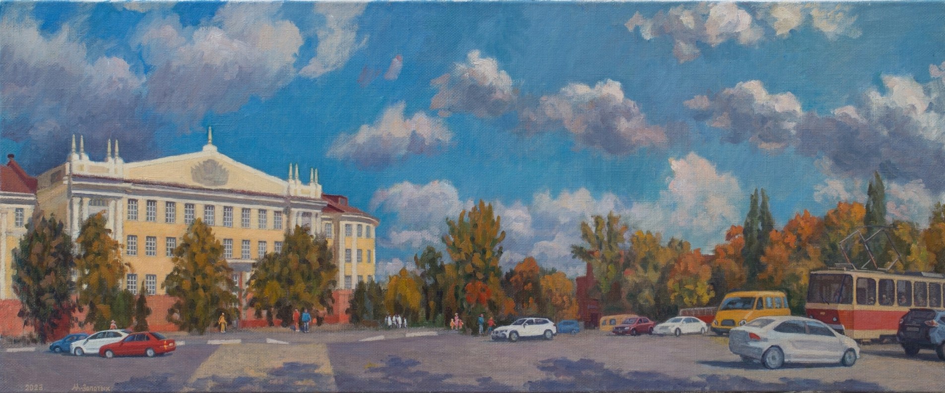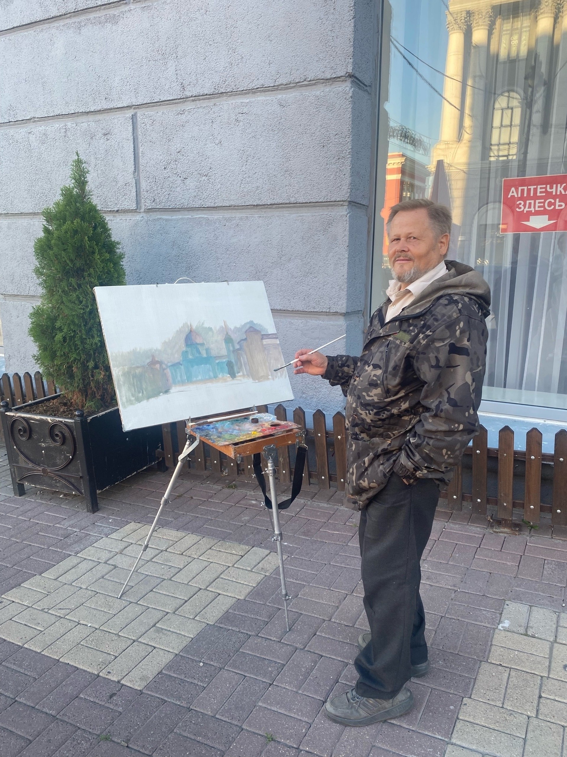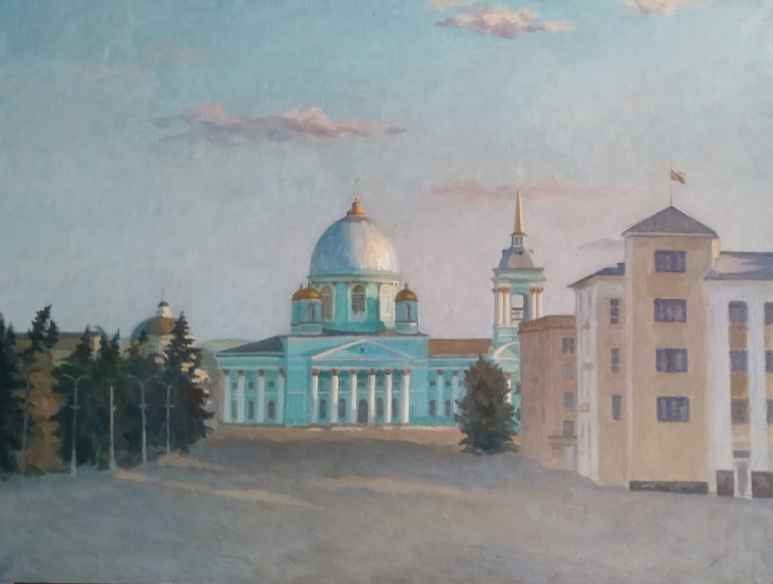 Во время одной из недавних прогулок по центральной площади, недалеко от федерального памятника архитектуры – Знаменского собора, мы стали свидетелями творческого процесса. Перед нами работал Михаил Золотых, член Союза художников России, лауреат премии имени Дейнеки. В пасмурный день кисть художника оживляла полотно, запечатлевая величие собора.