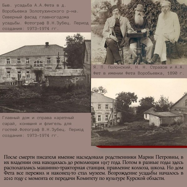 «Дом поэта Фета Афанасия Афанасьевича, у которого 12 июля 1879 г. гостил писатель Толстой Лев Николаевич и в 1892 г. бывал композитор Чайковский Петр Ильич» является объектом культурного наследия федерального значения, который свободно могут посетить все желающие. Находится он в Курской области, Золотухинского район, д. 1-я Воробьёвка, дом 81а.
