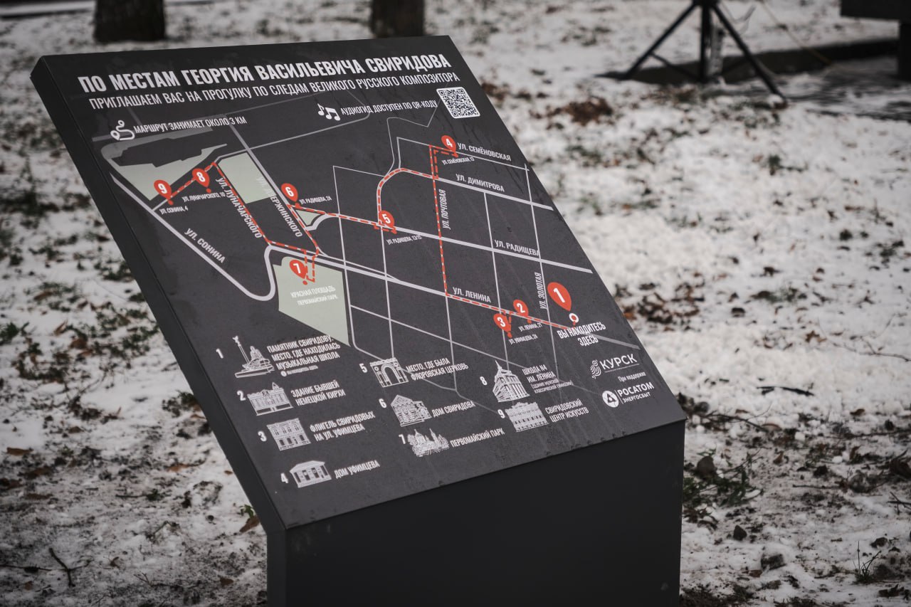 Открытие туристического маршрута стало ярким событием этого дня. Журналист РИА «Курск» Алексей Пищулин при поддержке Министерства информации и общественных коммуникаций Курской области разработал двухчасовой маршрут по 9 знаковым местам, связанным с детством и юностью Свиридова.