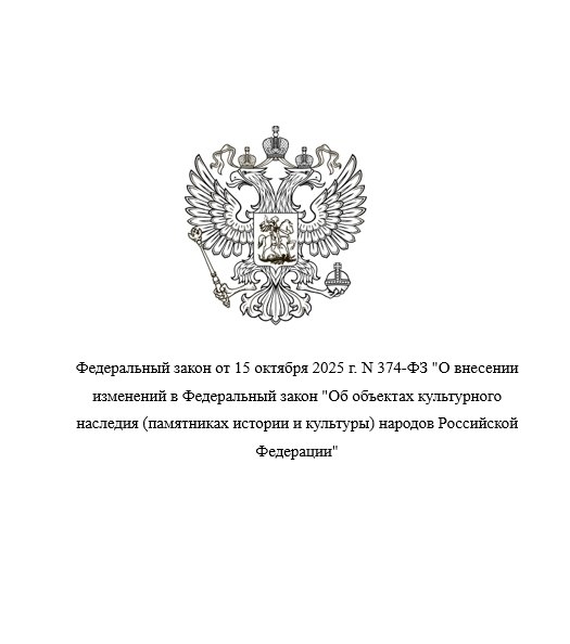 15 декабря вступил в силу Федеральный закон от 15.10.2025 № 374-ФЗ «О внесении изменений в Федеральный закон «Об объектах культурного наследия (памятниках истории и культуры) народов Российской Федерации».