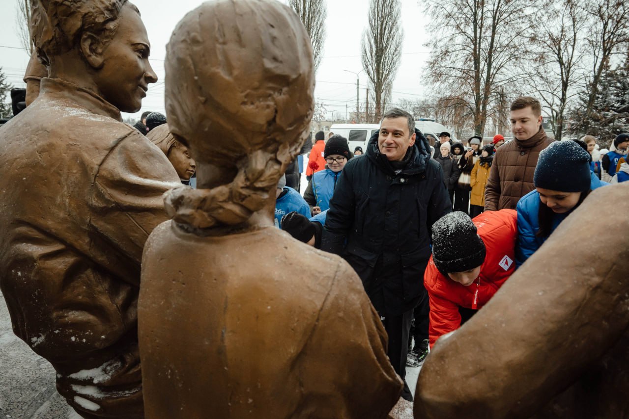 Скульптурная композиция посвящена всем добровольцам и волонтерам. Автор работы – академик Российской академии художеств Салават Щербаков. Перед этим Российская академия художеств проводила Всероссийский открытый конкурс, по итогам которого отобрали 6 лучших работ от ведущих скульпторов страны. За этот проект проголосовали 64% курян.