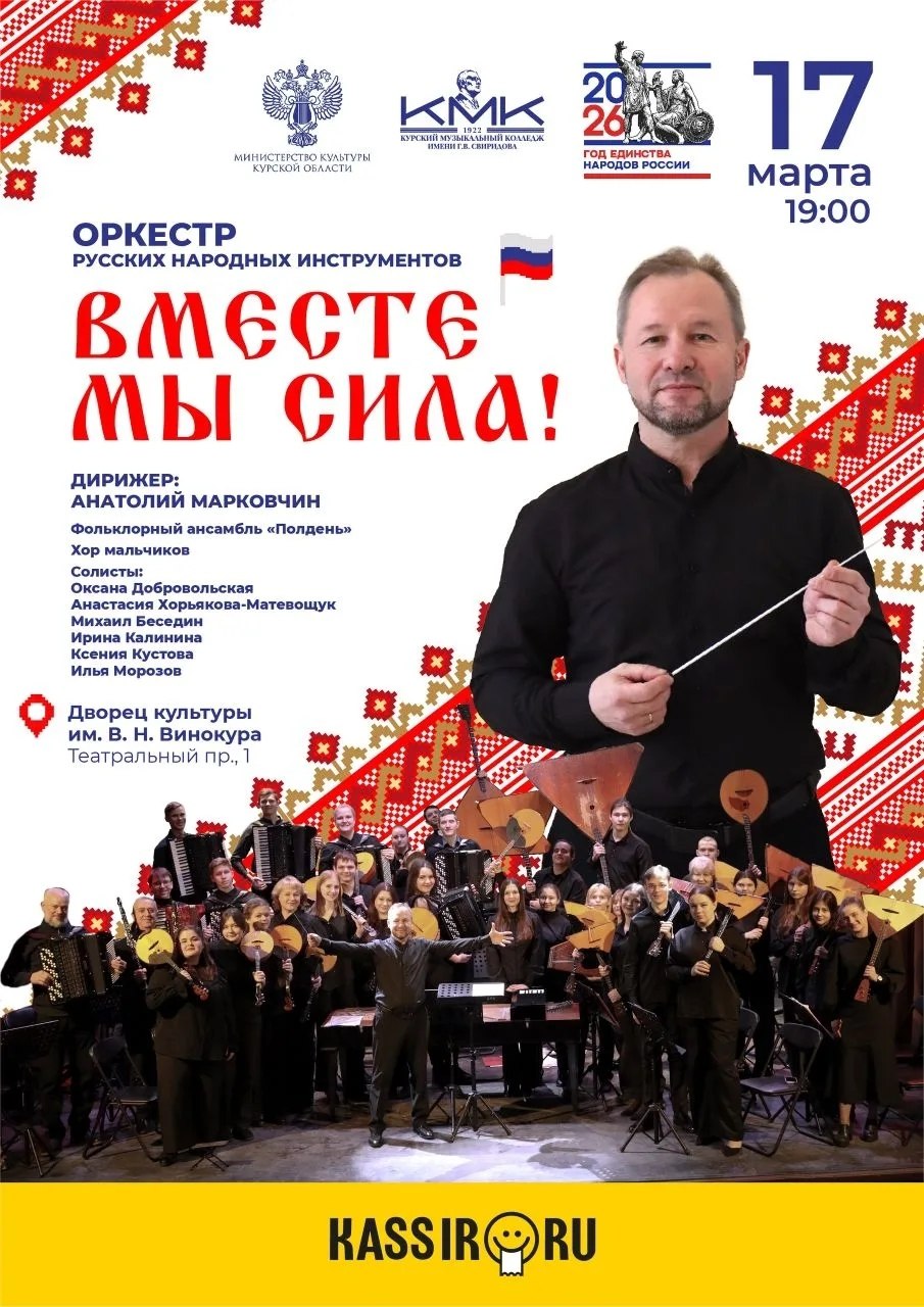 17 марта в 19:00 на сцене Дворца культуры им. В. Н. Винокура выступит Оркестр русских народных инструментов Курского музыкального колледжа им. Г. В. Свиридова с концертной программой «Вместе мы сила». Дирижер - Анатолий Марковчин.