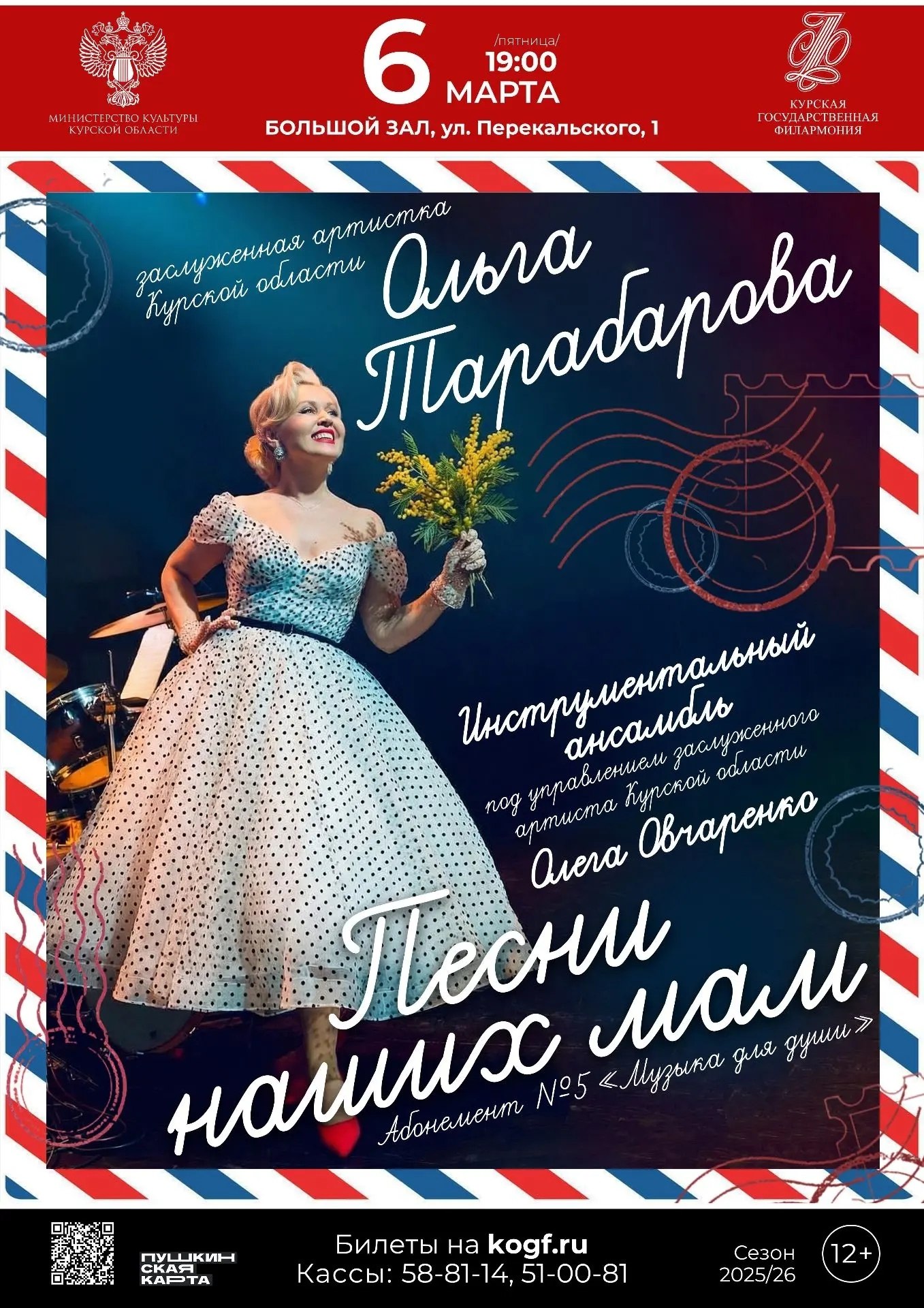 6 марта в 19:00 в Курской государственной филармонии состоится концерт абонемента № 5 «Музыка для души» - вечер, наполненный тёплыми воспоминаниями и душевными мелодиями. Программа «Песни наших мам» подарит зрителям встречу с любимыми композициями, знакомыми каждому с детства.