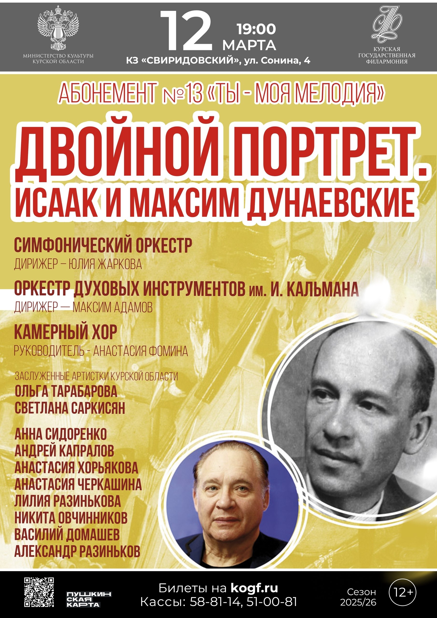 12 марта в Курской государственной филармонии состоится концерт абонемента № 13 «Ты - моя мелодия» - «Двойной портрет: Исаак и Максим Дунаевские»