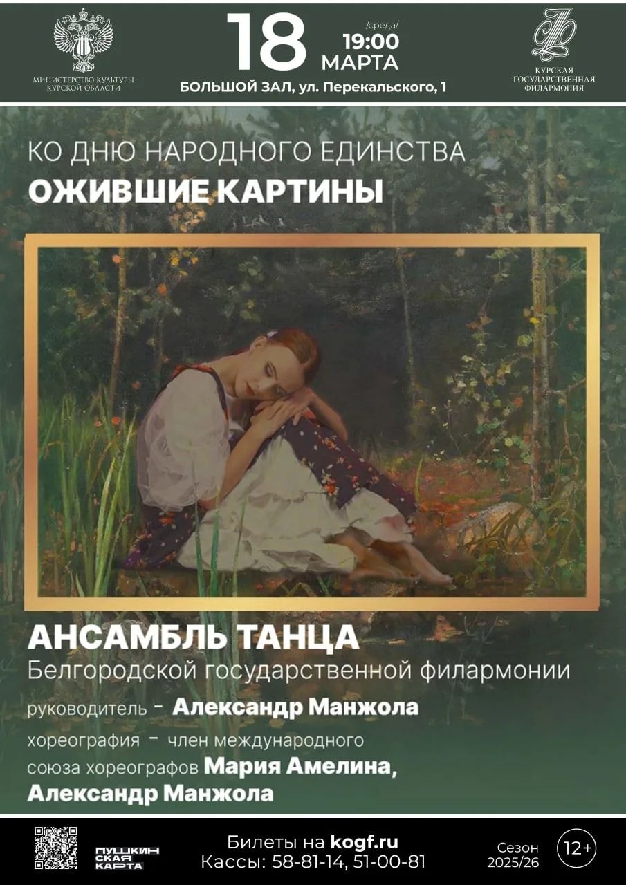 18 марта в 19:00 в Большом зале Курской государственной филармонии состоится показ хореографического спектакля «Ожившие картины» в исполнении Ансамбля танца Белгородской государственной филармонии.