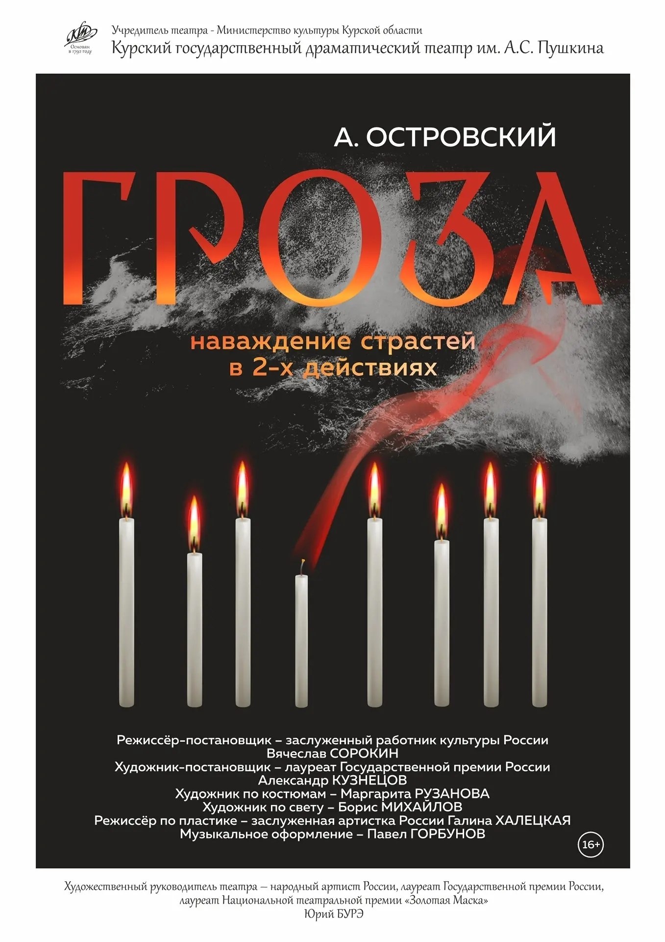 17 апреля в 18:00 на Большой сцене Курского драматического театра им. А.С. Пушкина состоится премьера спектакля «Гроза» по одноименной пьесе Александра Островского. Режиссёр – Вячеслав Сорокин.