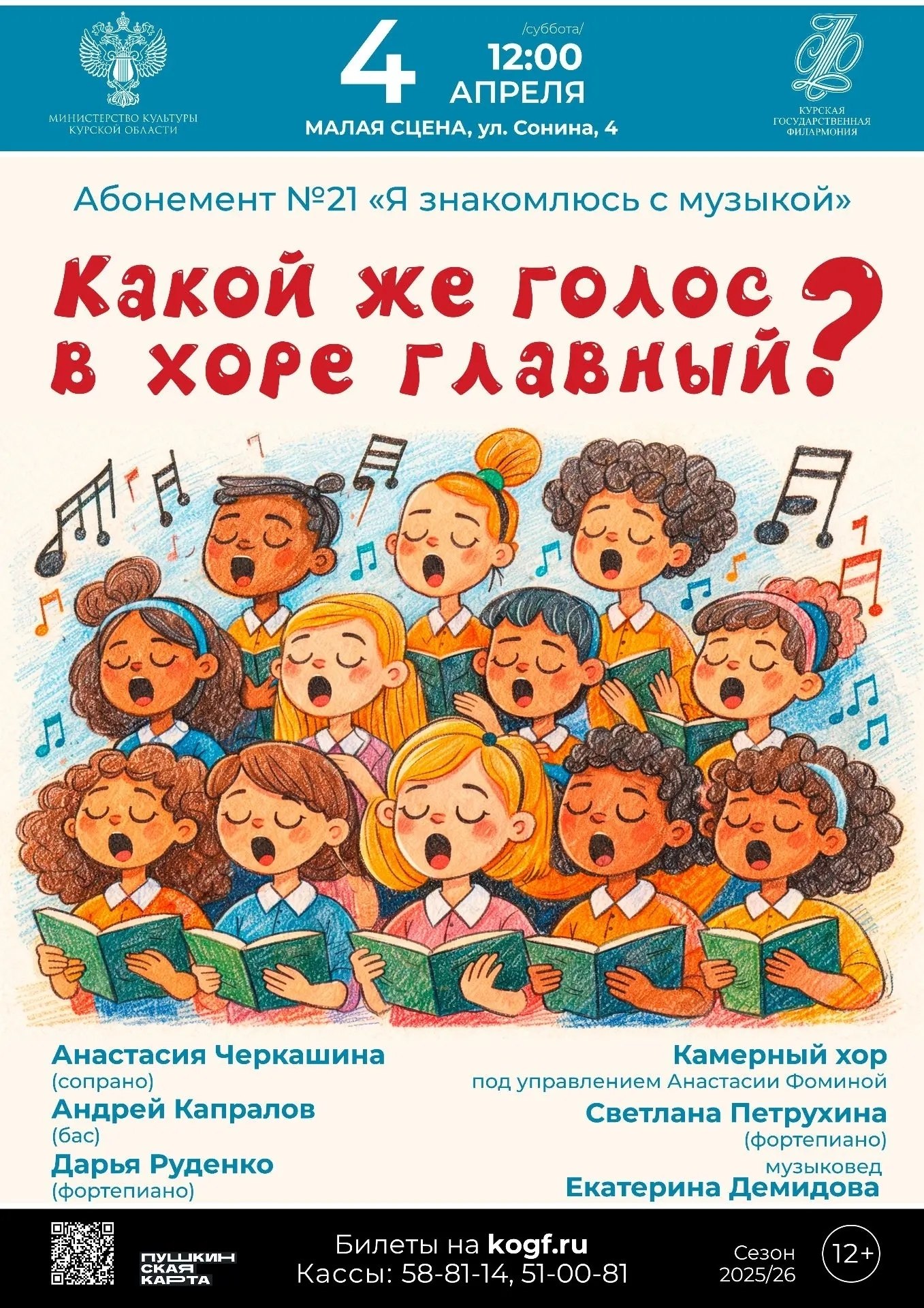 4 апреля в 12:00 на Малой сцене Концертного зала «Свиридовский» Курской государственной филармонии состоится концерт «Какой же голос в хоре главный?» - встреча в рамках авторского абонемента №21 «Я знакомлюсь с музыкой» музыковеда Екатерины Демидовой.