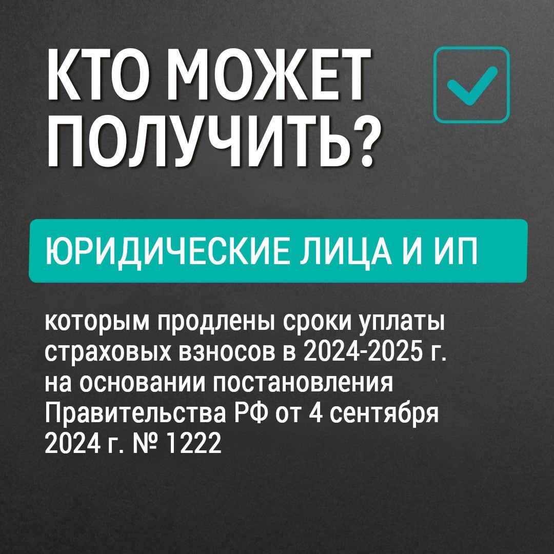 Получатели: юридические лица и индивидуальные предприниматели, которым были продлены сроки уплаты страховых взносов в 2024 - 2025 годах на основании постановления Правительства РФ от 4 сентября 2024 г. № 1222 и постановления Правительства Курской области от 23 сентября 2024 г. № 786-пп.