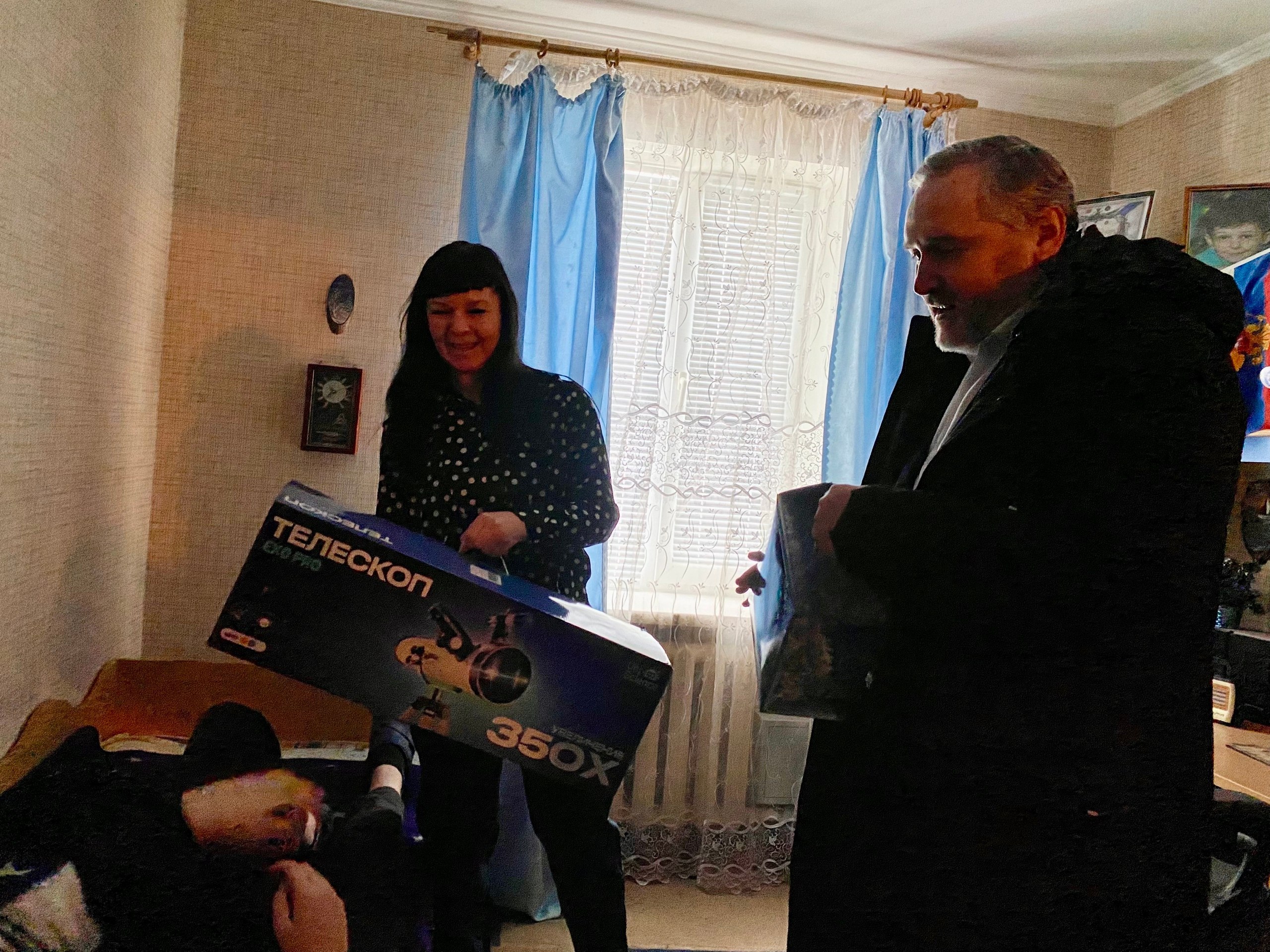 Плюс одна исполненная детская мечта. Глава министерства промышленности, торговли и предпринимательства Курской области Андрей Ветров приехал в гости к семье Сорокиных с подарками. 15-летняя Кира увлечена астрономией. Мама Ольга говорит: девочка просто грезит звёздами, изучает все нюансы и поэтому заказала на Новый год...телескоп. Шарик с её мёчтой и снял с «Ёлки желаний» Андрей Ветров.