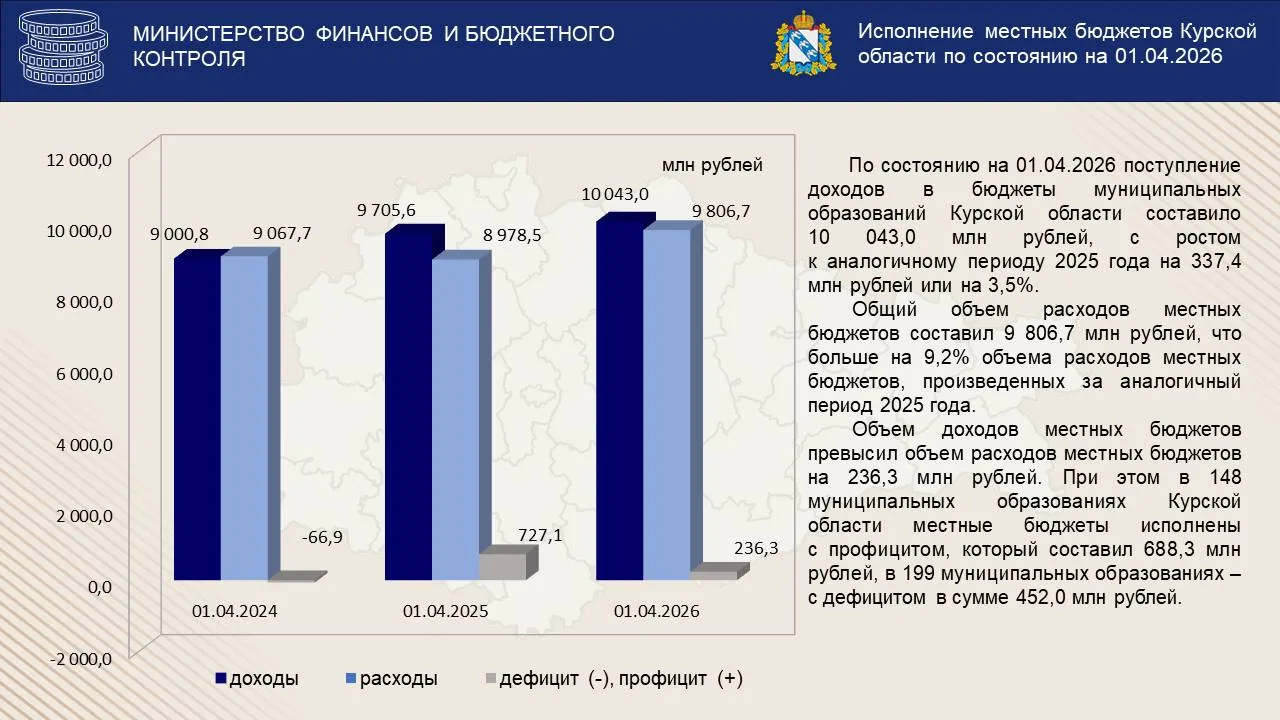 Министерством финансов и бюджетного контроля проведен анализ исполнения бюджетов муниципальных образований Курской области по состоянию на 01.04.2026.