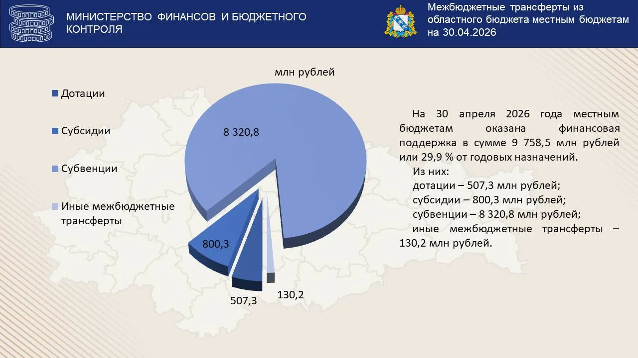 На сегодняшний день из бюджета Курской области бюджетам муниципальных образований Курской области предоставлены межбюджетные трансферты на общую сумму 9 758,5 млн рублей или 29,9 % от годовых назначений, из них:
