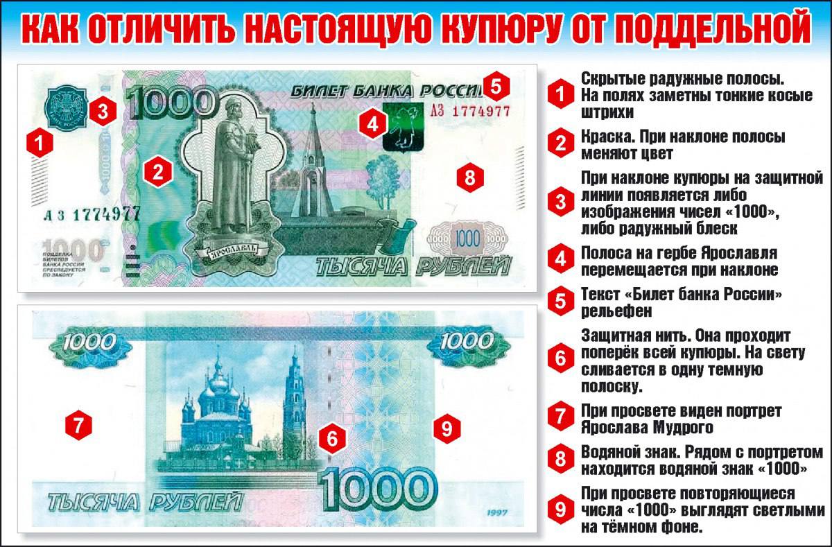 Отличить фальшивку от подлинной купюры можно по следующим признакам:
