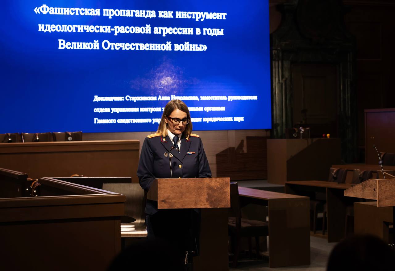 В выступлении заместителя руководителя седьмого отдела (аналитического сопровождения следствия) ГСУ СК России А.Н. Старжинской на тему «Фашистская пропаганда как инструмент идеологически-расовой агрессии в годы Великой Отечественной войны» были охарактеризованы пропагандистские технологии Третьего Рейха. Она подчеркнула, что с целью внедрения нужной идеологии в массовое сознание фашистами был создан специальный пропагандистский аппарат, который постепенно расширялся как по численности, так и по охвату сфер влияния. Анна Николаевна перечислила каналы воздействия на население, среди которых печатные издания, кинематограф, театр, музыка и радио. Также она подробно рассказала о деятельности фашистов, которая была нацелена на молодежь, как потенциальный объект для манипуляции и пропаганды.