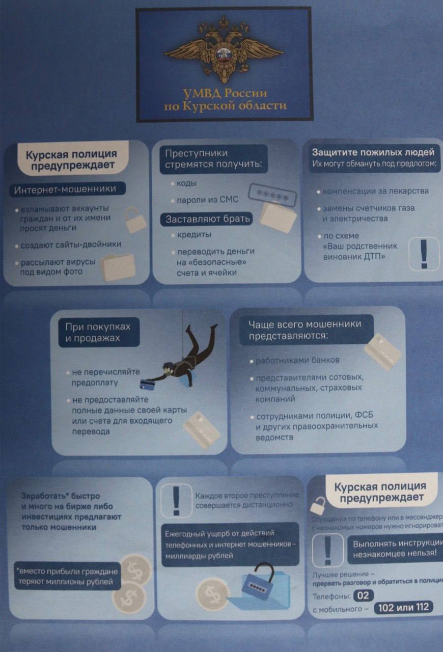 На примерах часто встречающихся фактов противоправных действий он довел основные правила безопасности: никому не сообщать код из смс , фраза “безопасный счет” используется только мошенниками ,