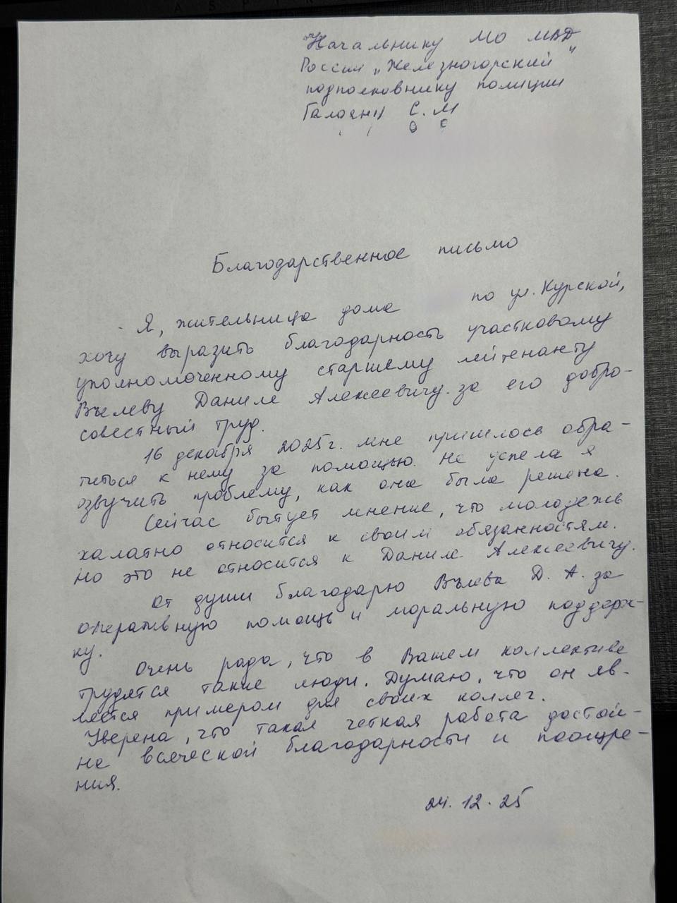 На имя начальника МО МВД России «Железногорский» поступила благодарность от местной жительницы в адрес участкового уполномоченного старшего лейтенанта полиции Данила Вълева.