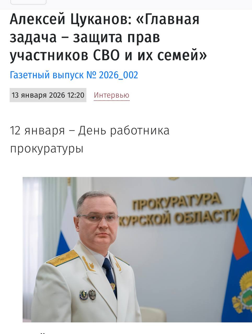 Предлагаем Вашему вниманию интервью прокурора Курской области Алексея Цуканова газете «Курская правда». С текстом интервью можно ознакомиться, перейдя по ссылке https://kpravda.ru/2026/01/13/aleksej-czukanov-glavnaya-zadacha-zashhita-prav-uchastnikov-svo-i-ih-semej/?ysclid=mkcf8t9m5s716570484
