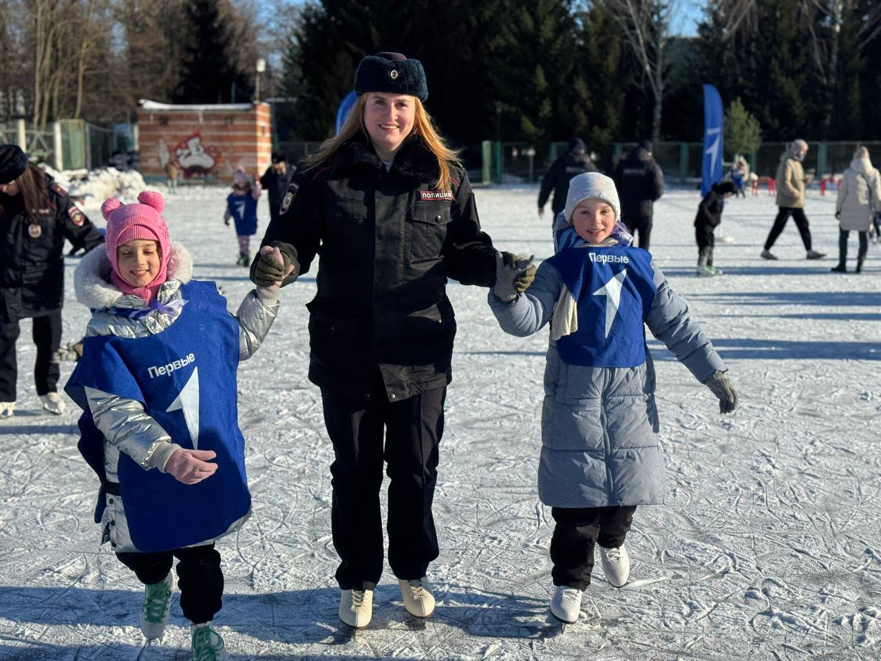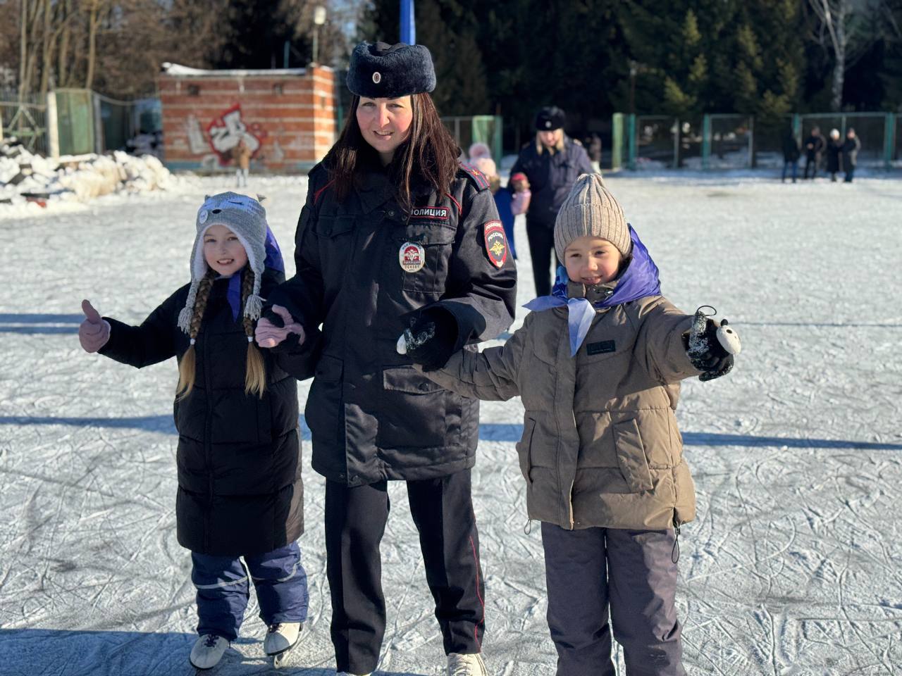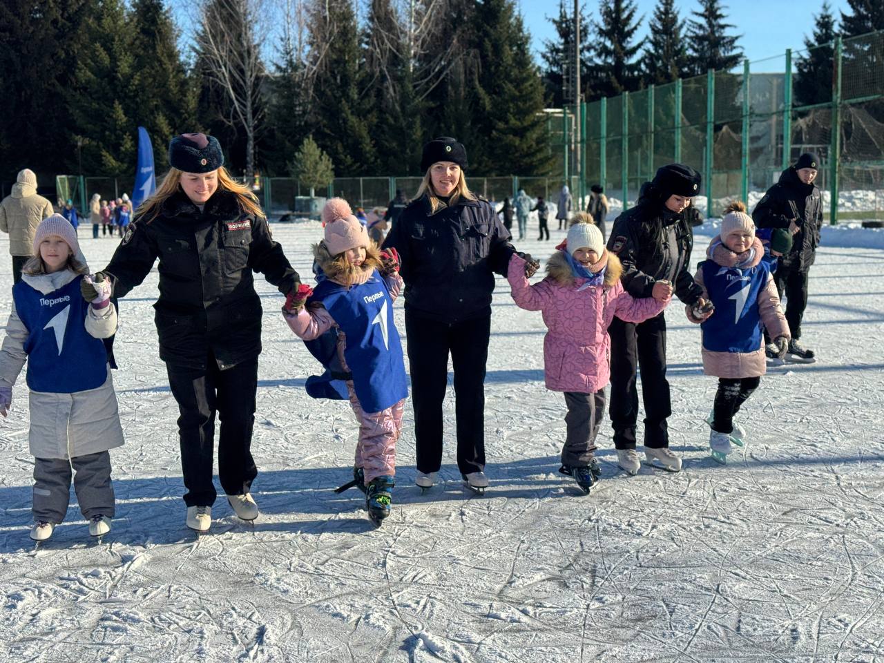 Полицейские четко объясняли, как держаться на льду, помогали детям делать первые движения и заботливо поддерживали их во время катания. Прекрасное настроение создала и солнечная морозная погода.