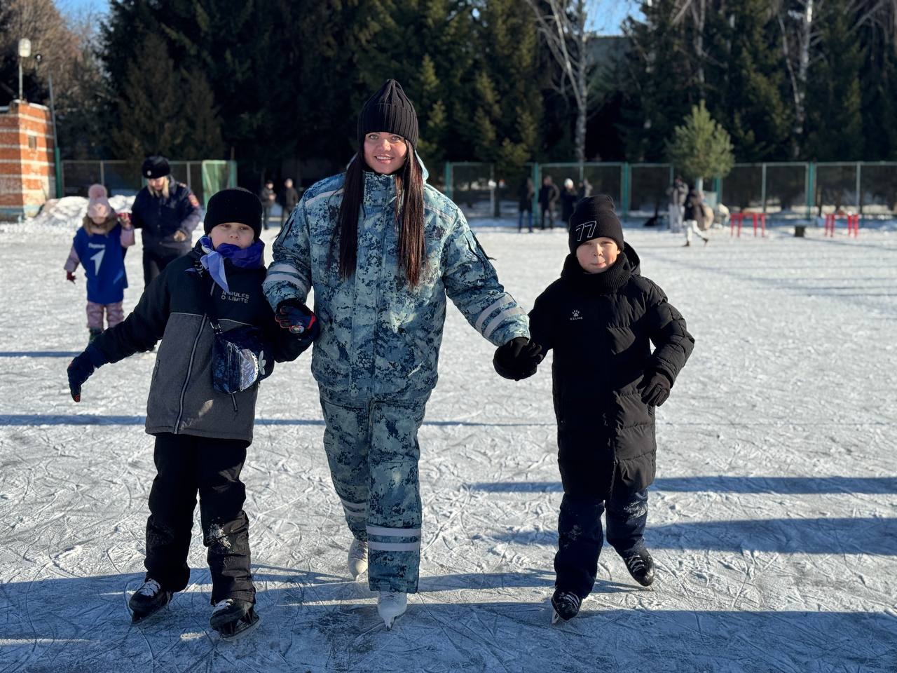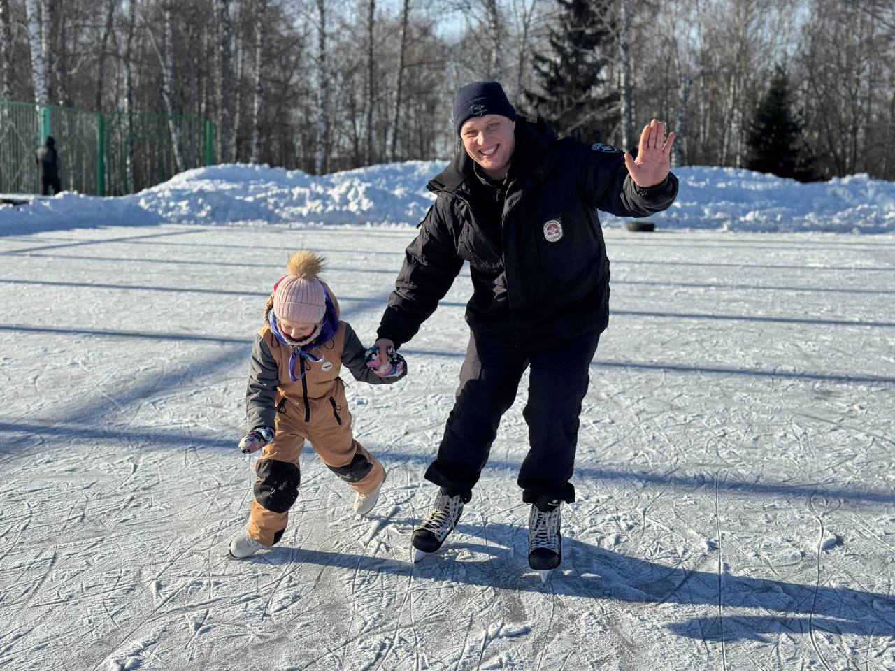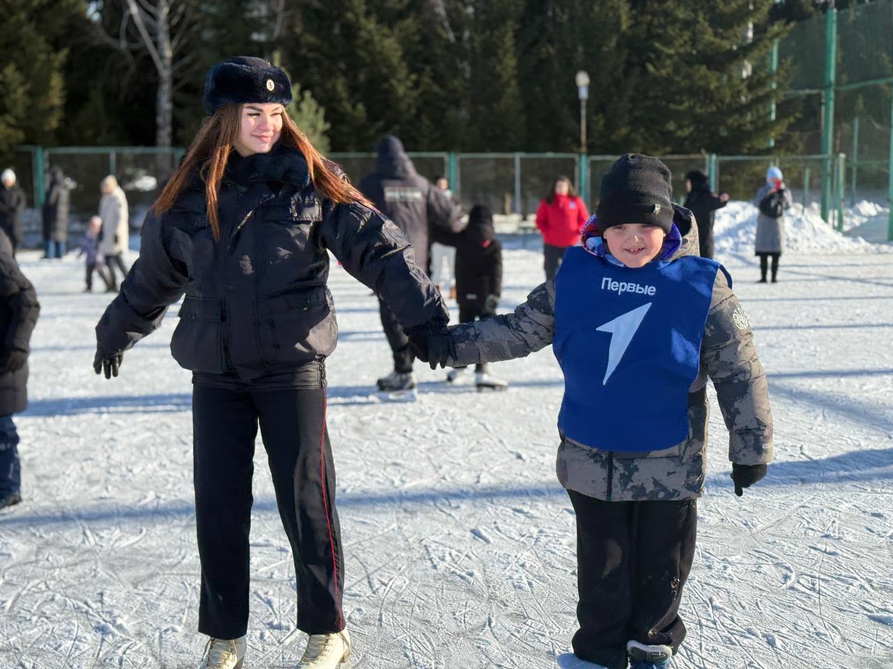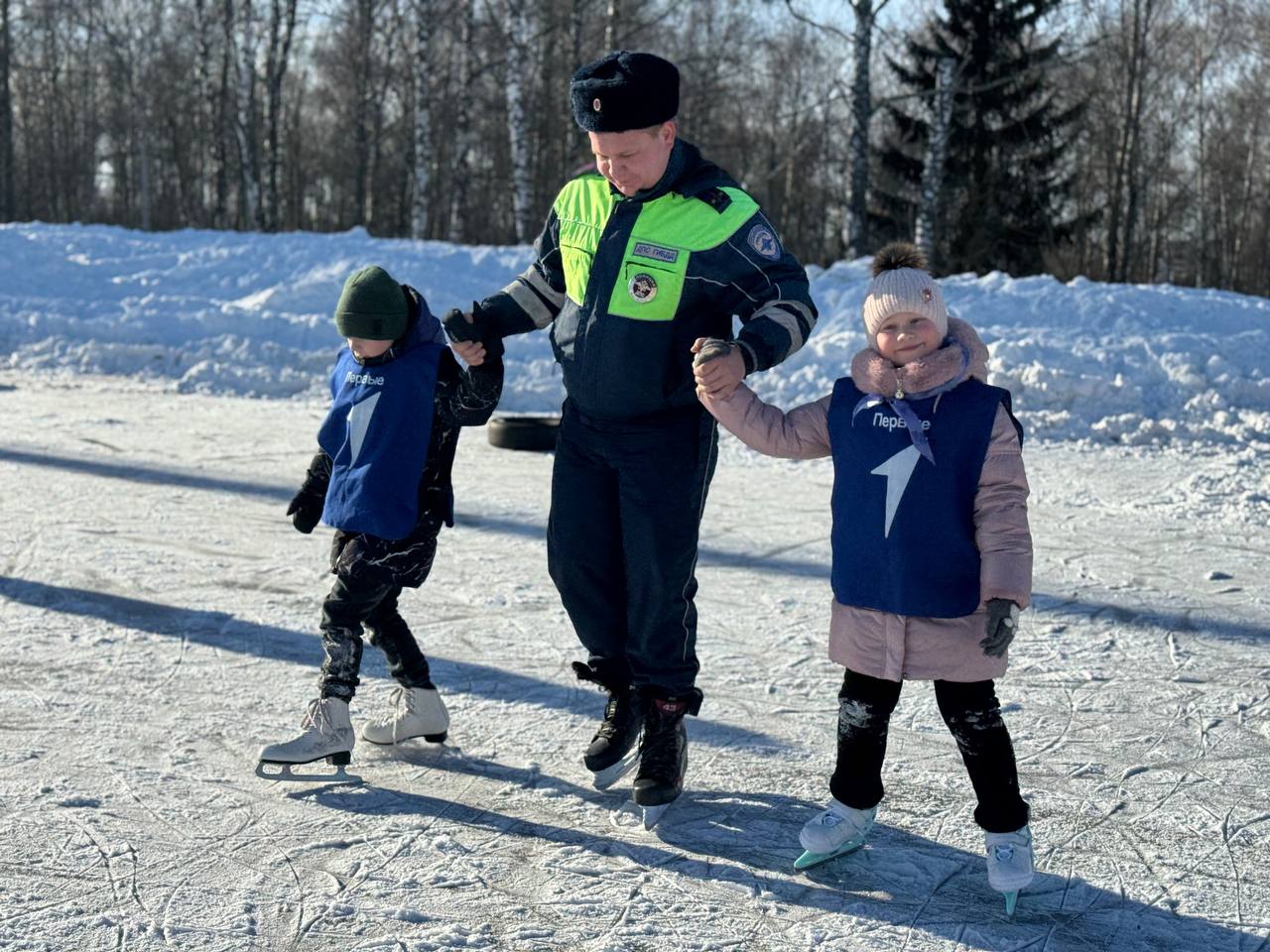 Полицейские четко объясняли, как держаться на льду, помогали детям делать первые движения и заботливо поддерживали их во время катания. Прекрасное настроение создала и солнечная морозная погода.