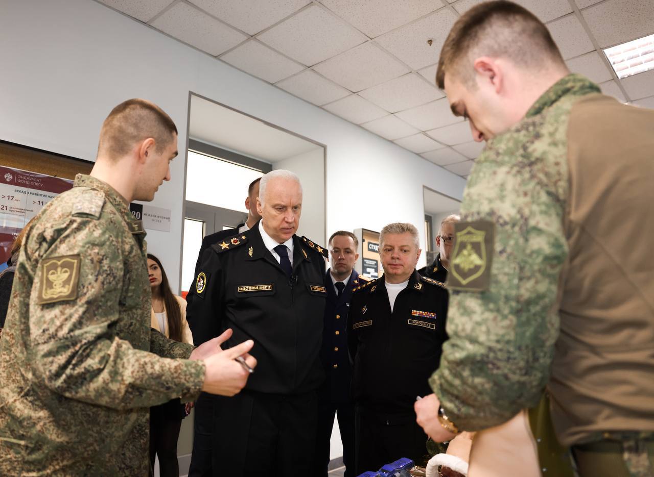 В рамках визита в СПбГУ глава СК России посетил выставку с образцами вооружения, организованную военнослужащими Вооруженных Сил России в стенах университета.