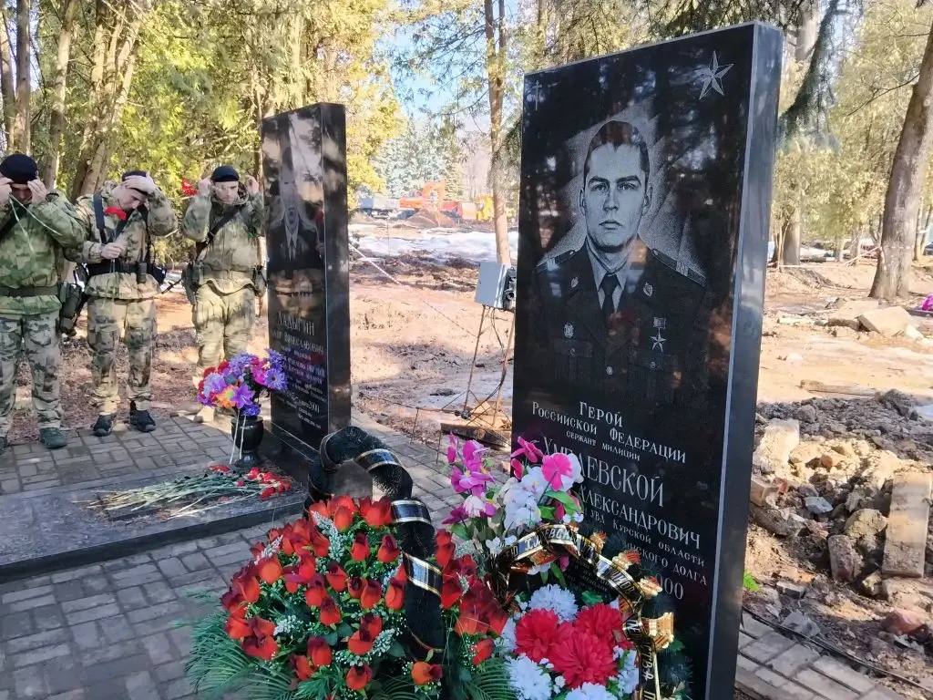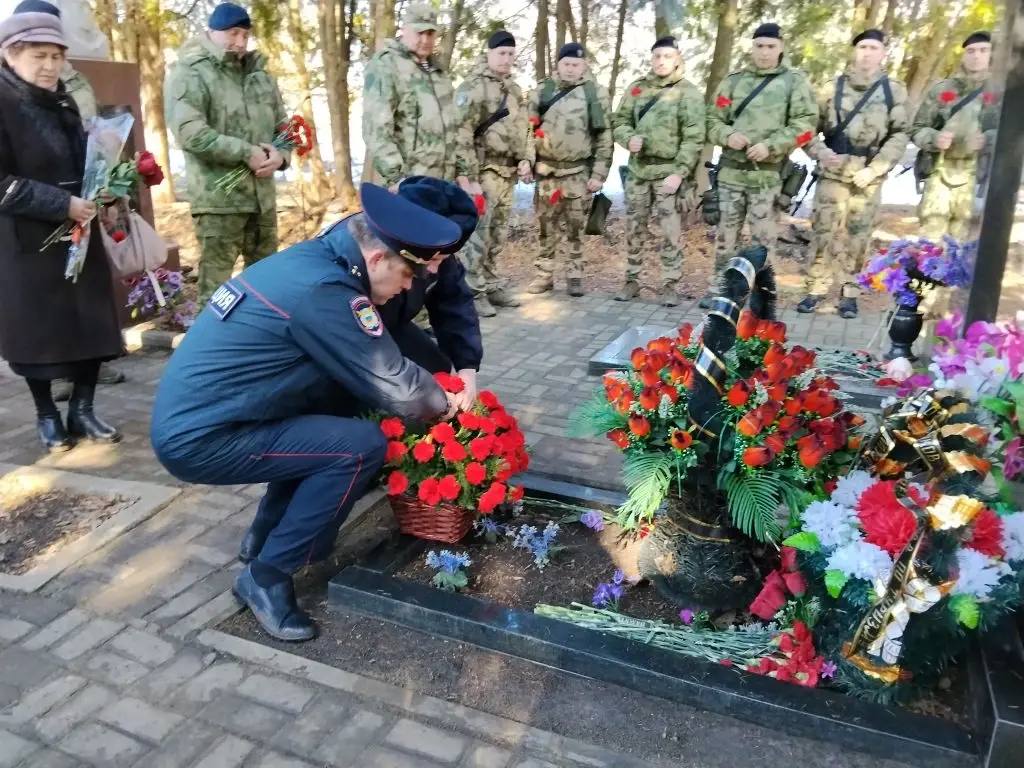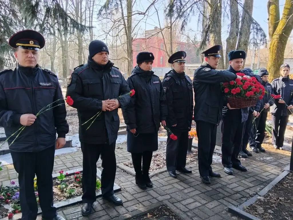 Сотрудники УМВД России по Курской области, ветераны органов внутренних дел и сотрудники Росгвардии приняли участие в церемонии возложения цветов и венков к могиле Героя России Андрея Хмелевского на мемориале «Памяти павших в Великой Отечественной войне 1941–1945 гг.».