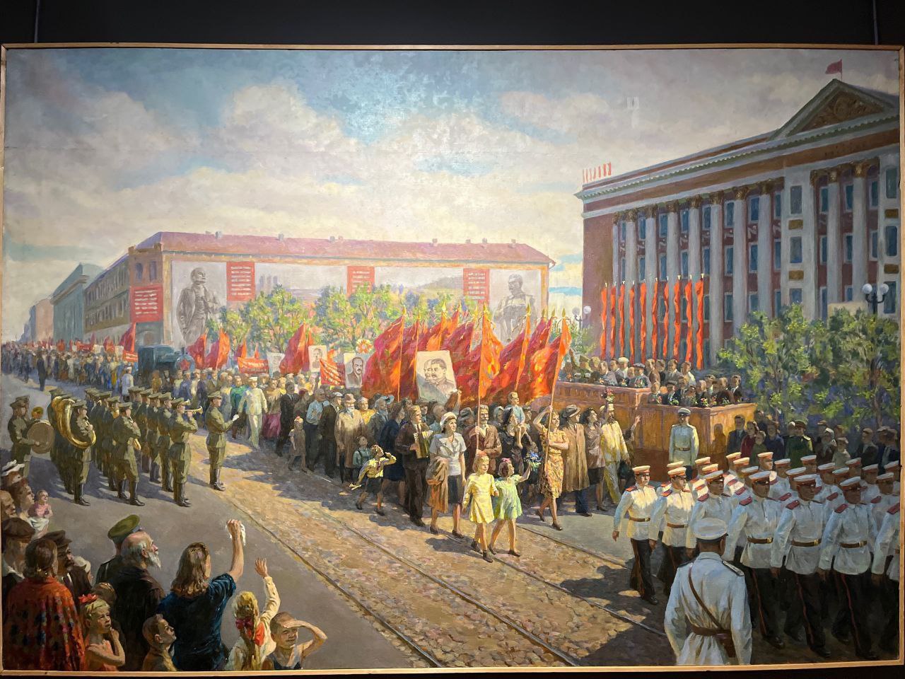 На картинах — Курск прошлого: Первомайская демонстрация на Красной площади, улица Дзержинского в 70-е, старые домики, которых уже нет. Авторы — Иван Бакуцкий, Константин Андреев, Владимир Дайбов и другие художники, стоявшие у истоков курского Союза.