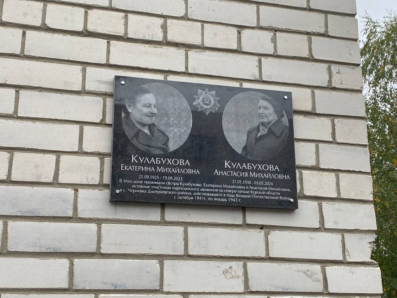 Мемориальную доску в честь партизанок, участниц Великой Отечественной войны открыли на фасаде дома, где проживали сёстры Екатерина и Анастасия Кулабуховы. Они были активными участницами партизанского движения в Дмитриевском районе с 1941 по 1943 годы.