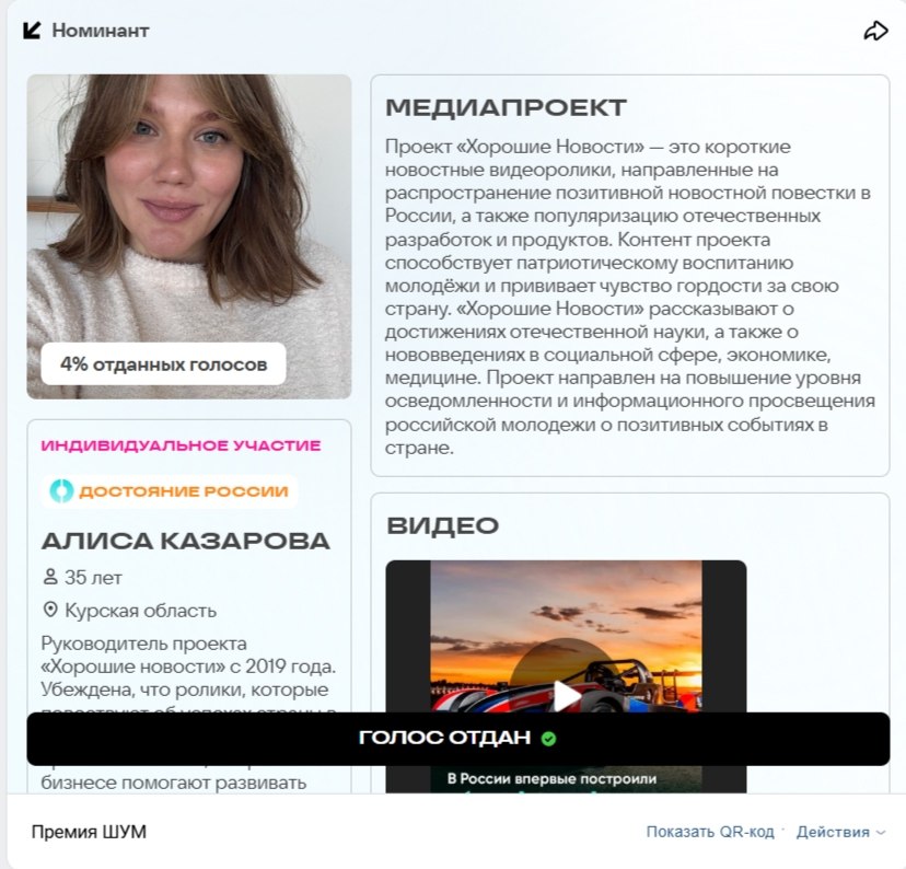 Всероссийская молодёжная премия в сфере медиа и журналистики «ШУМ» объявила финалистов, и среди них – талантливый медиаспециалист из Курской области – Алиса Казарова!