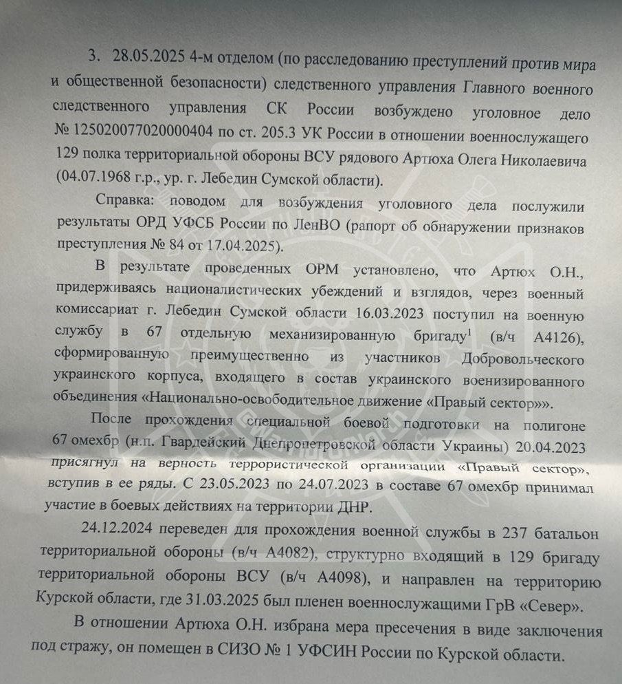 07.10.2025 2 окружным западным военным судом осуждён по ч. 2 ст. 205, ч. 2 ст. 205.3, ч. 2 ст. 205.4ч. 2 ст. 205.5 УК РФ стрелок 1 роты 129 бригады ТРО ВСУ рядовой Артюх Олег Николаевич (04.07.1968 г.р. г. Лебедин Сумской области) и приговорен к 26 годам лишения свободы. Первые 6 лет в тюрьме, 20 лет в исправительной колонии строгого режима.