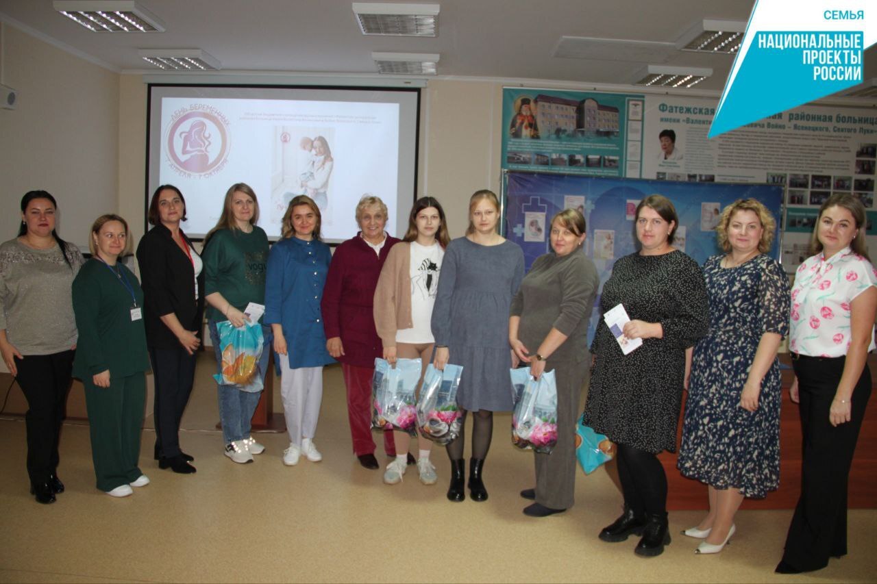 7 октября в России отмечается День беременных. Этот новый праздник появился в календаре в 2023 году. На базе Фатежской центральной районной больницы фатежанки, ожидающие появления на свет малышей, получили консультации врача-гинеколога Елены Коростелевой, начальника отдела ЗАГС администрации района Юлии Басовой, педагога-психолога Центра «Семья» из поселка Поныри Марии Калужских.