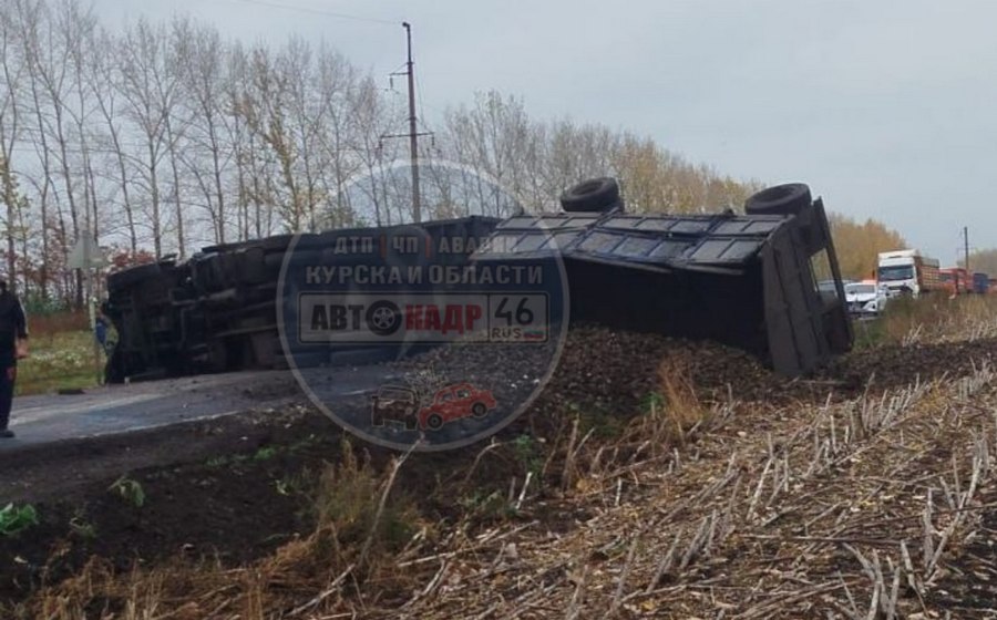 В Касторенском районе Курской области рано утром произошла авария, которая парализовала движение на дороге. Большегруз с прицепом перевернулся, блокировав движение машин.