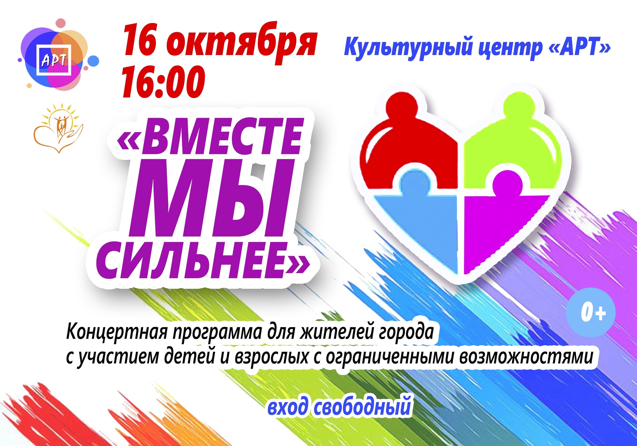 16 октября в 16-00 Культурный центр "АРТ" приглашает всех жителей и гостей города Железногорска на концерт с участием Центра развития и социальной адаптации "Мы вместе".