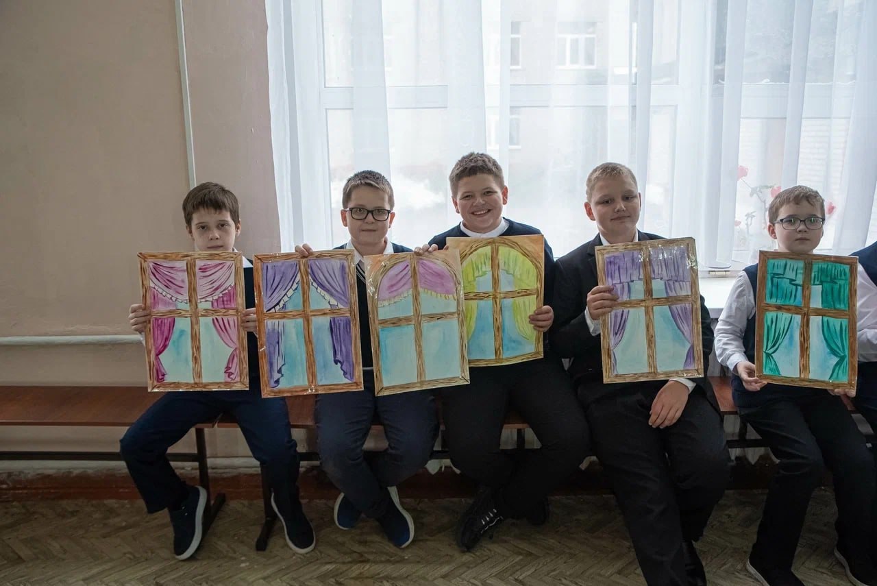 К этой важной дате в школе торжественно открыли выставку. Александр Федорович лично отбирал работы для экспозиции, а некоторые из них он решил передать школе.