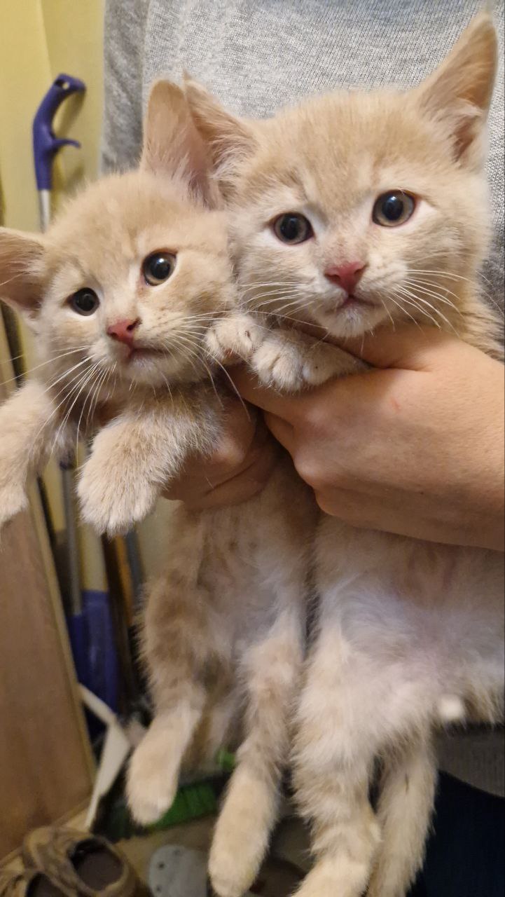 Два котика 3,5 месяцев из Курского приграничья с точки эвакуации. Персиковые! Толстые, активные. В клетке сидеть не хотят, хотят на ручки. Лоток сразу нашли