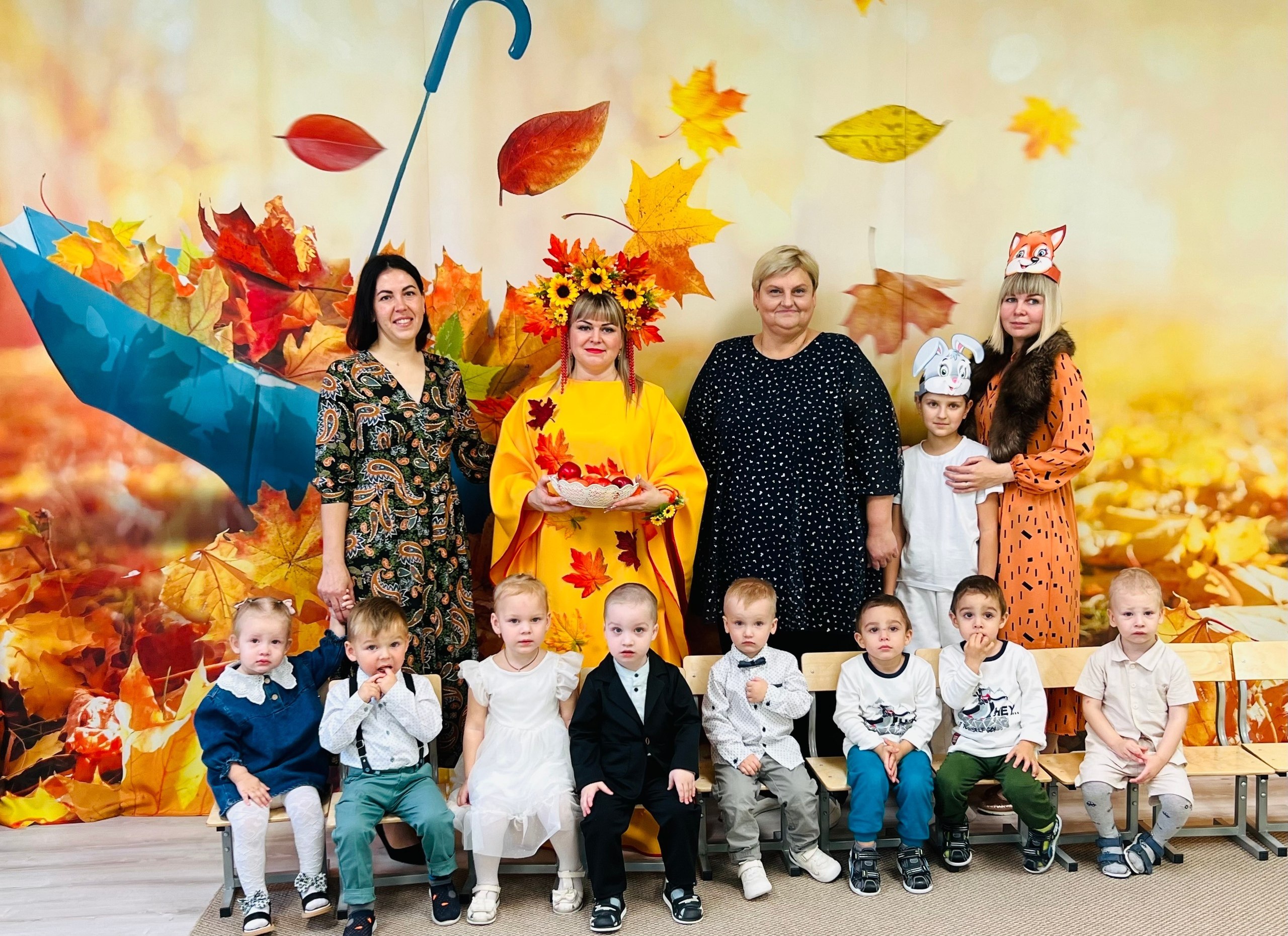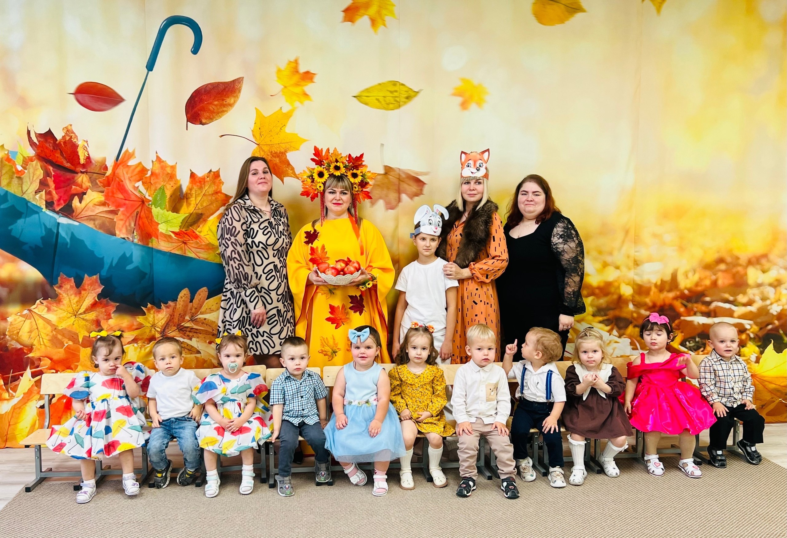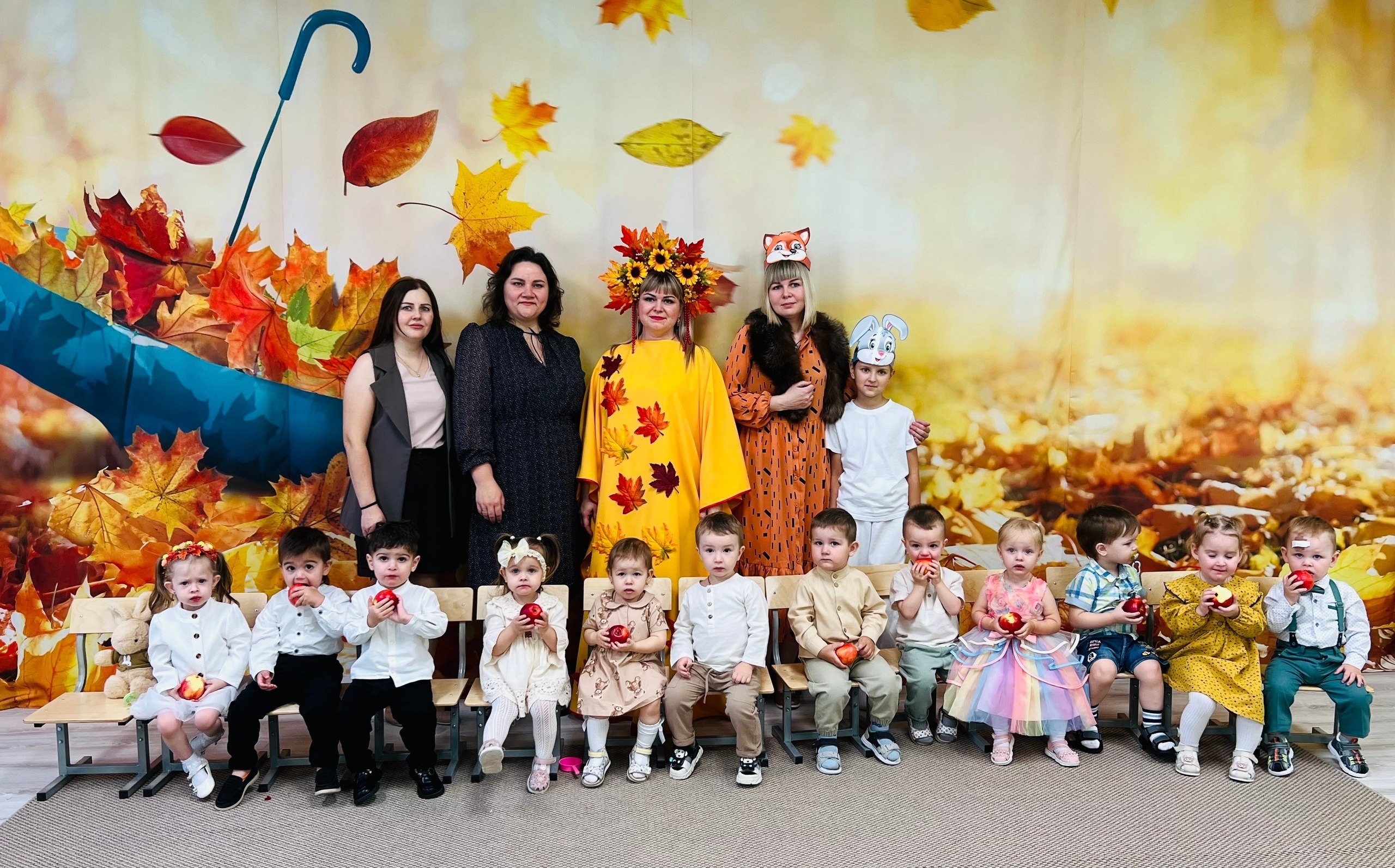 Особенным гостем стала прекрасная Осень, вместе с которой пришли Зайчик и Лисичка. Вместе со сказочными героями наши маленькие артисты танцевали и весело участвовали в играх .Завершилось мероприятие настоящим угощением от щедрой Осени — ароматными и вкусными яблоками.