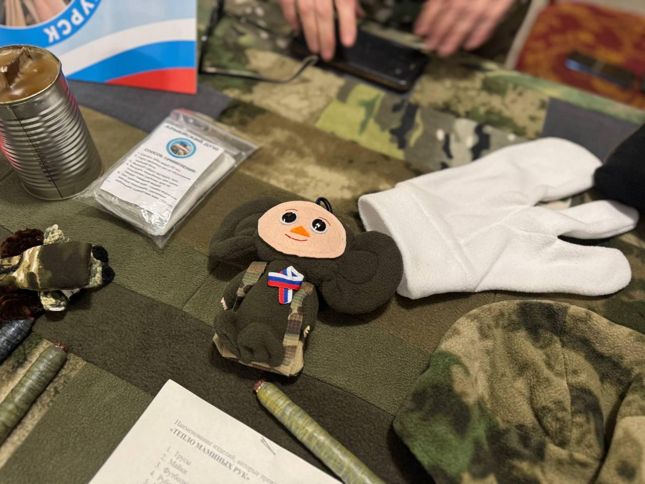- Мы четвертый год работаем для фронта, изготавливаем больше 40 наименований продукции: вот маскировочные костюмы, дождевики, носилки-волокуши, спички долгого горения - на 15-20 минут их можно поставить сугроб, при сильном ветре не гаснут, за это время военнослужащий может согреть чашку кофе. Смотрите, каких чебурашек вяжем и шьем, а в них вкладываем молитву о помощи. Из кусочков пледов и вот такие подушки изготавливаем, - рассказывает руководитель группы "Тепло маминых рук" Галина Перелыгина.