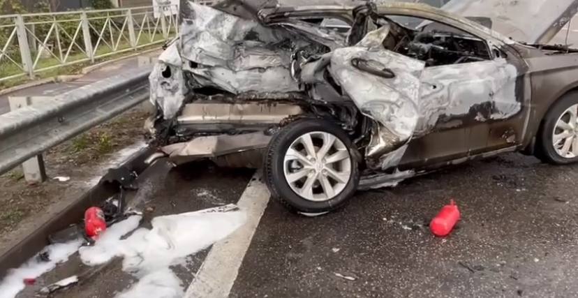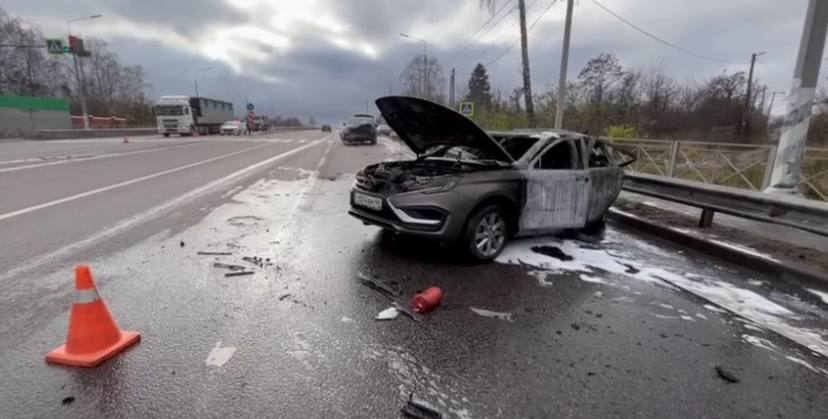 Здесь столкнулись «Шевроле Тахо» и «Лада Веста». В результате удара «Лада» загорелась.