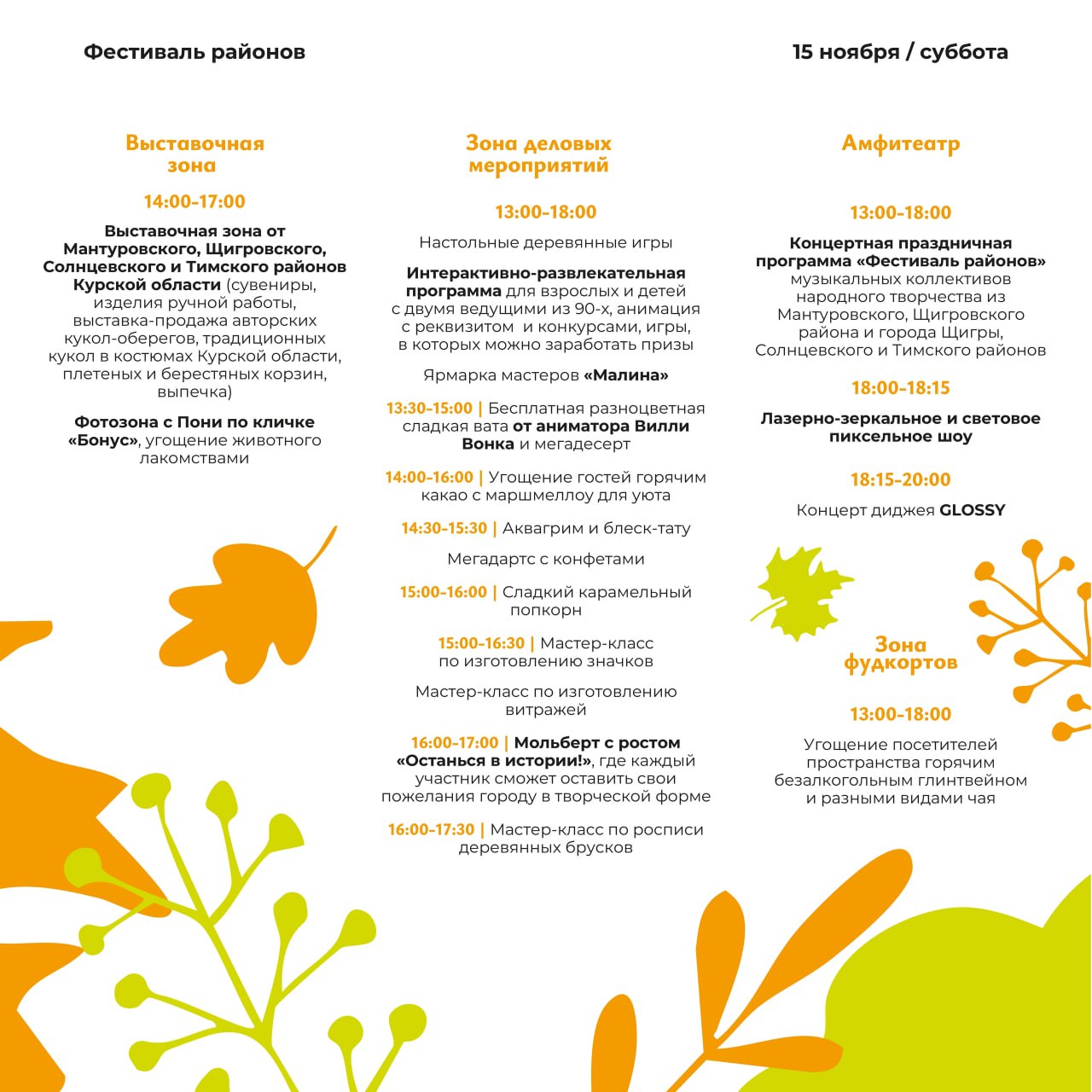 Приглашаем 15 ноября на Фестиваль районов на Полугоре. Вас ждут интересные мастер-классы, конкурсы, живой концерт коллективов народного творчества Мантуровского, Щигровского, Солнцевского и Тимского районов, а также выставка работ местных умельцев и курской ярмарки мастеров — «Малина». Вечер завершит выступление диджея GLOSSY. #ОсеньНаПолугоре #ПолугораФест #ФестивальРайонов46 #Курск