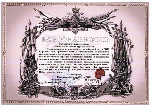 Благодарность от командования одной из войсковых частей пришла в адрес жителей Солнцевского района. Воины благодарят за помощь и неравнодушие.