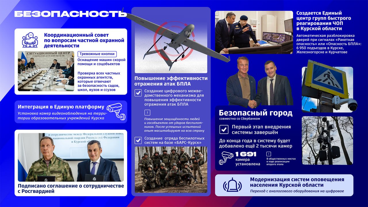 Один из ключевых приоритетов — обеспечение безопасности жителей Курской области. Александр Хинштейн сообщил, что в Курске начали внедрять систему «Безопасный город» в партнёрстве со «Сбером». Первый этап уже завершён: подключены 2 тысячи видеопотоков с камер домофонов и установлена 1 691 камера. Сейчас идёт работа над организацией каналов связи и подключением объектов к единой системе. В итоге комплекс сможет обрабатывать около 6 тысяч видеопотоков.
