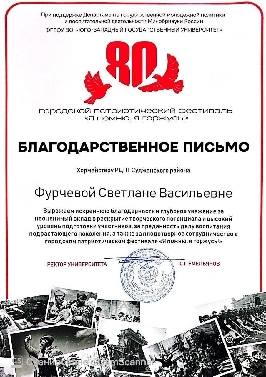 Мы искренне поздравляем Светлану Фурчеву, хормейстера Центрального Дома культуры — филиала МКУК «РЦНТ Суджанского района», с вручением Благодарственного письма от Юго-Западного госуниверситета. Светлана была отмечена за плодотворное сотрудничество, вклад в развитие творческого потенциала участников и высокий уровень организации фестиваля «Я помню, я горжусь». Также хотим отметить её ученика, Александра Агутина, солиста студии эстрадной песни «Ра-дас», который завоевал звание лауреата III степени.