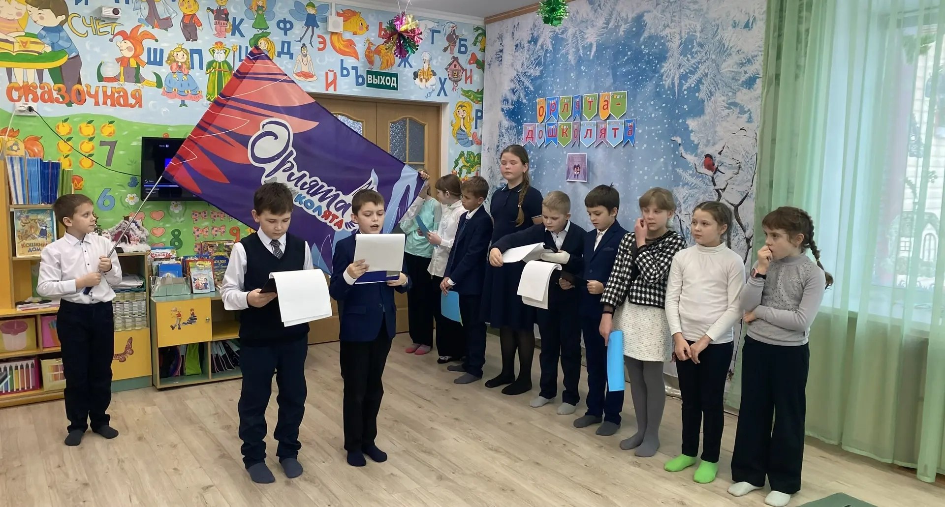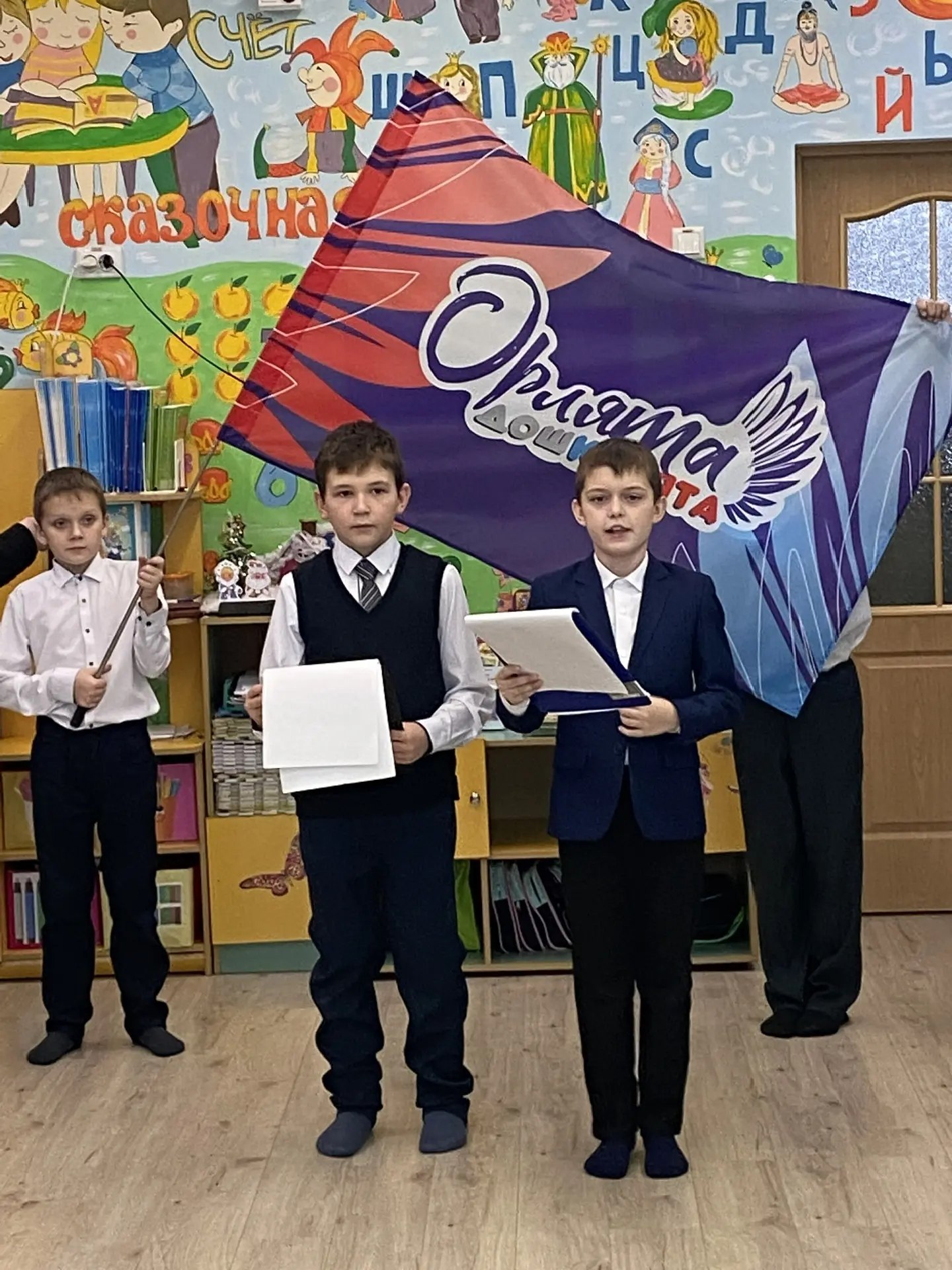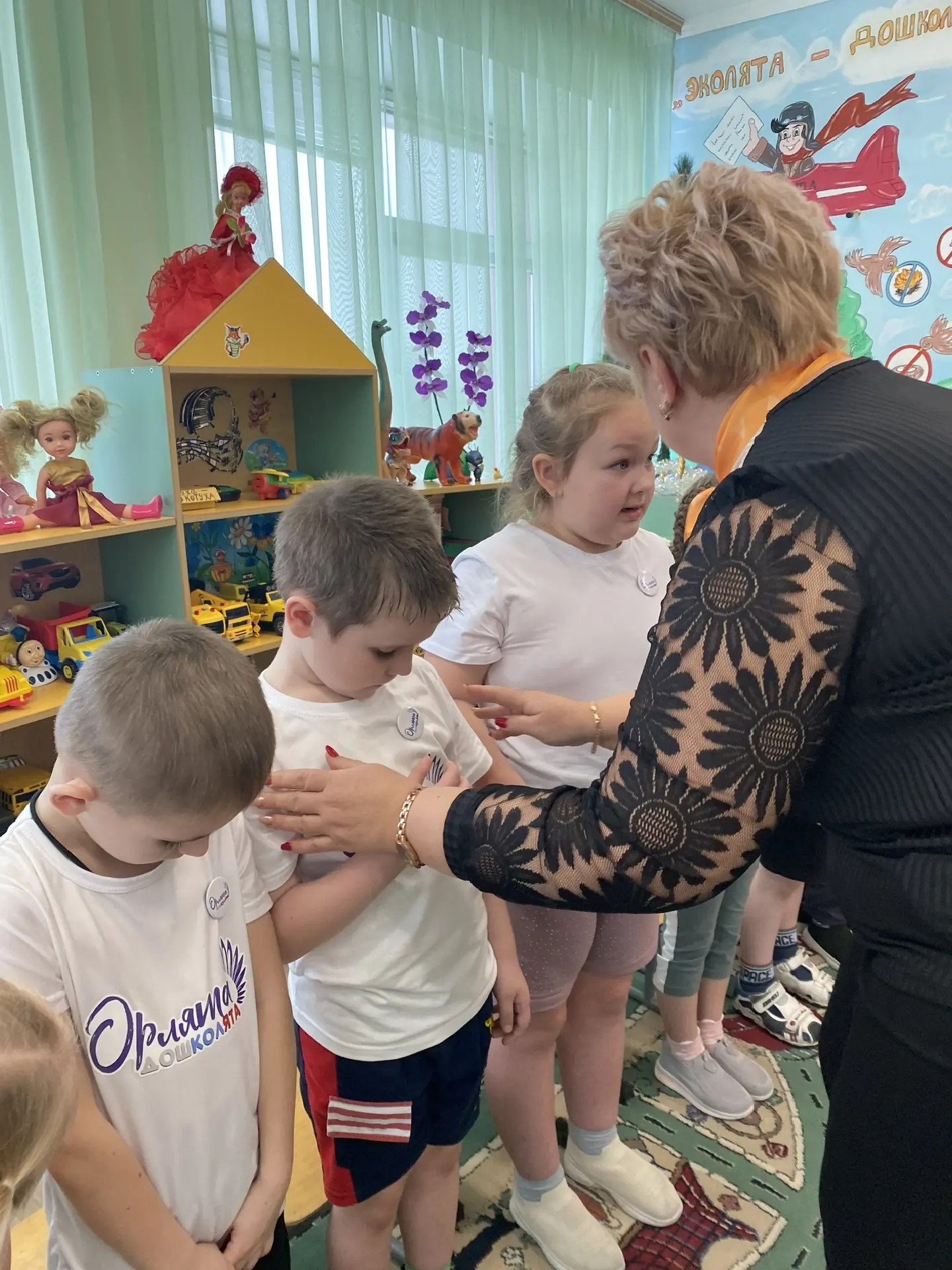 Юным Орлятам-дошколятам старшие товарищи повязали галстуки — символ принадлежности к содружеству «Орлят» и вручили значки с логотипом «Орлята».