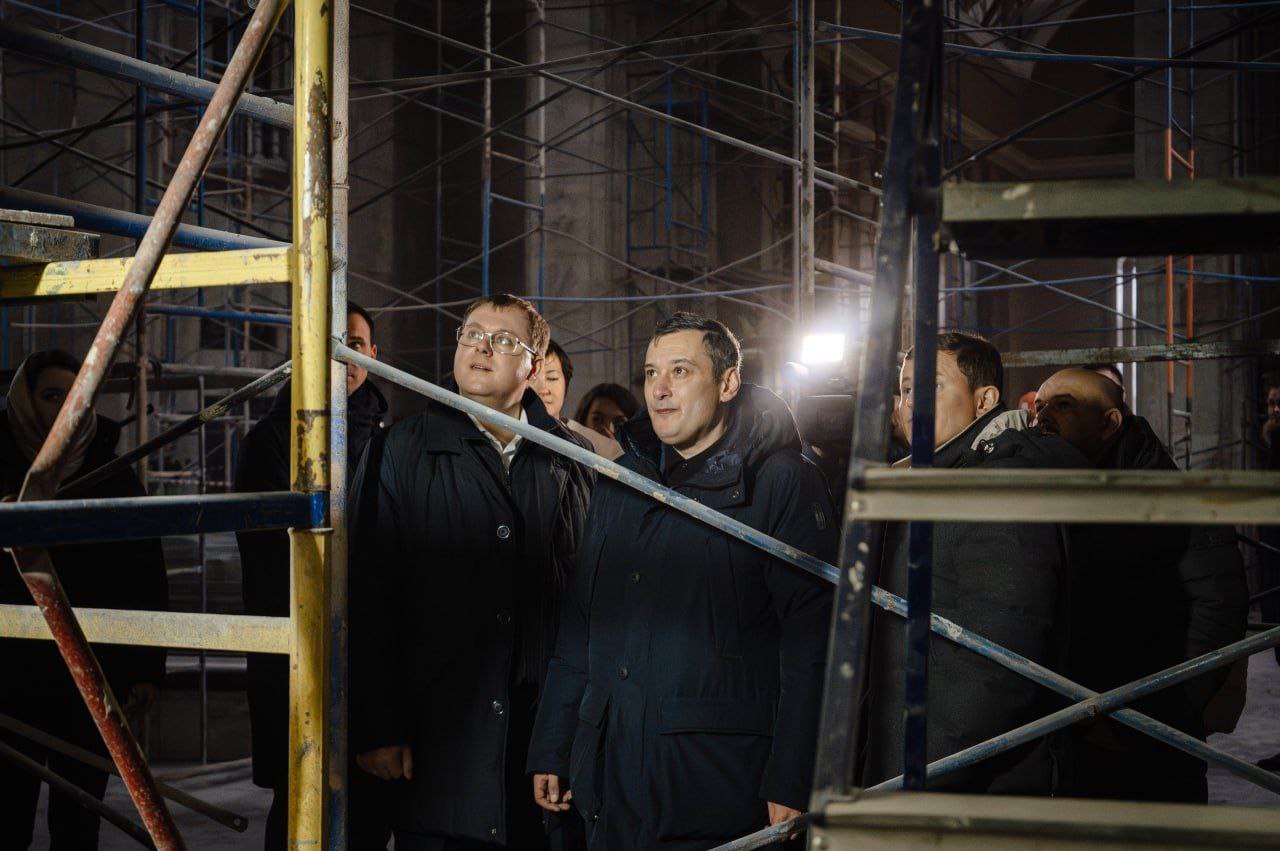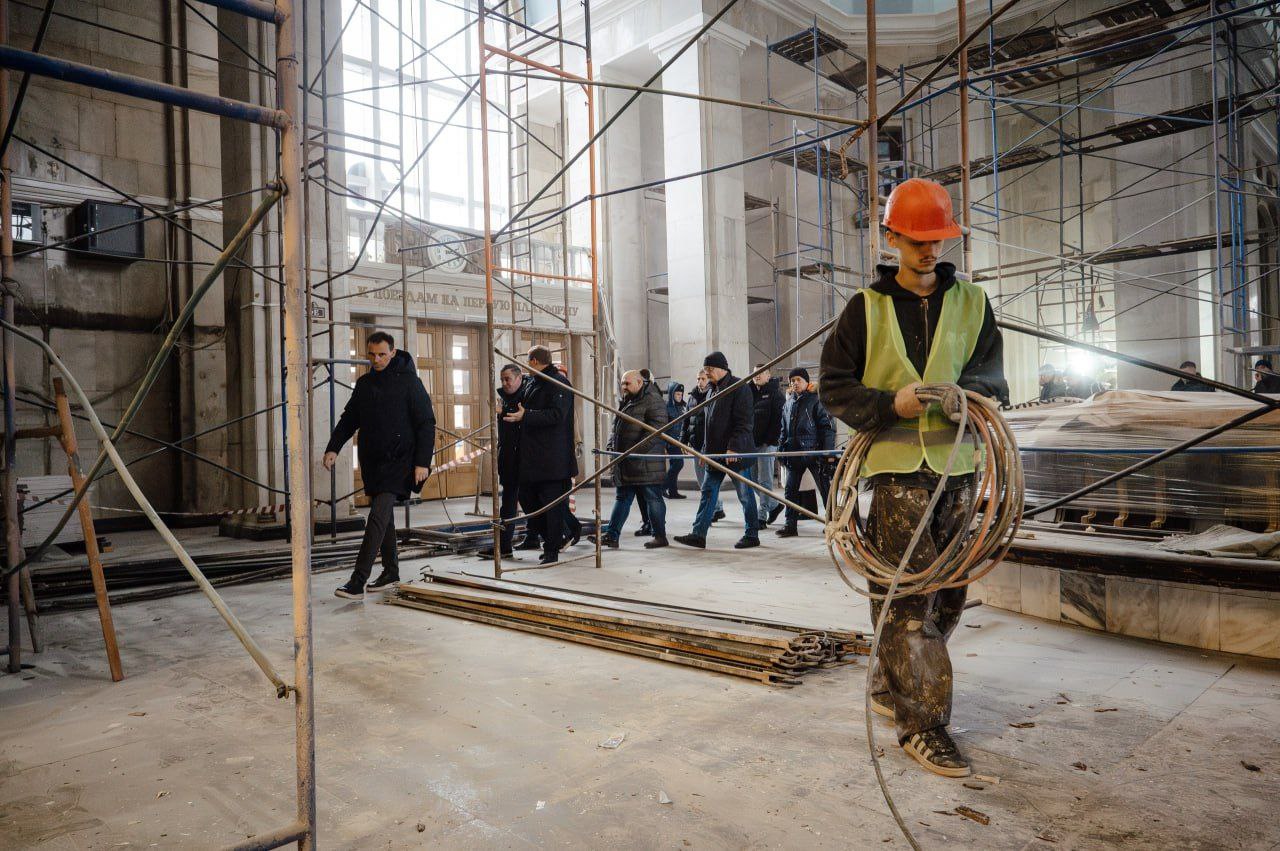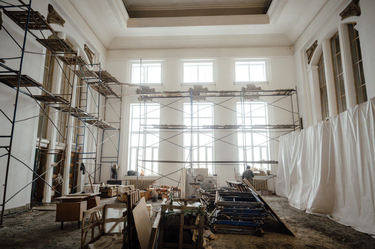 Работы ведутся с сохранением исторического облика здания: мастера воссоздают лепнину, оригинальные цвета и реставрируют мраморные элементы.