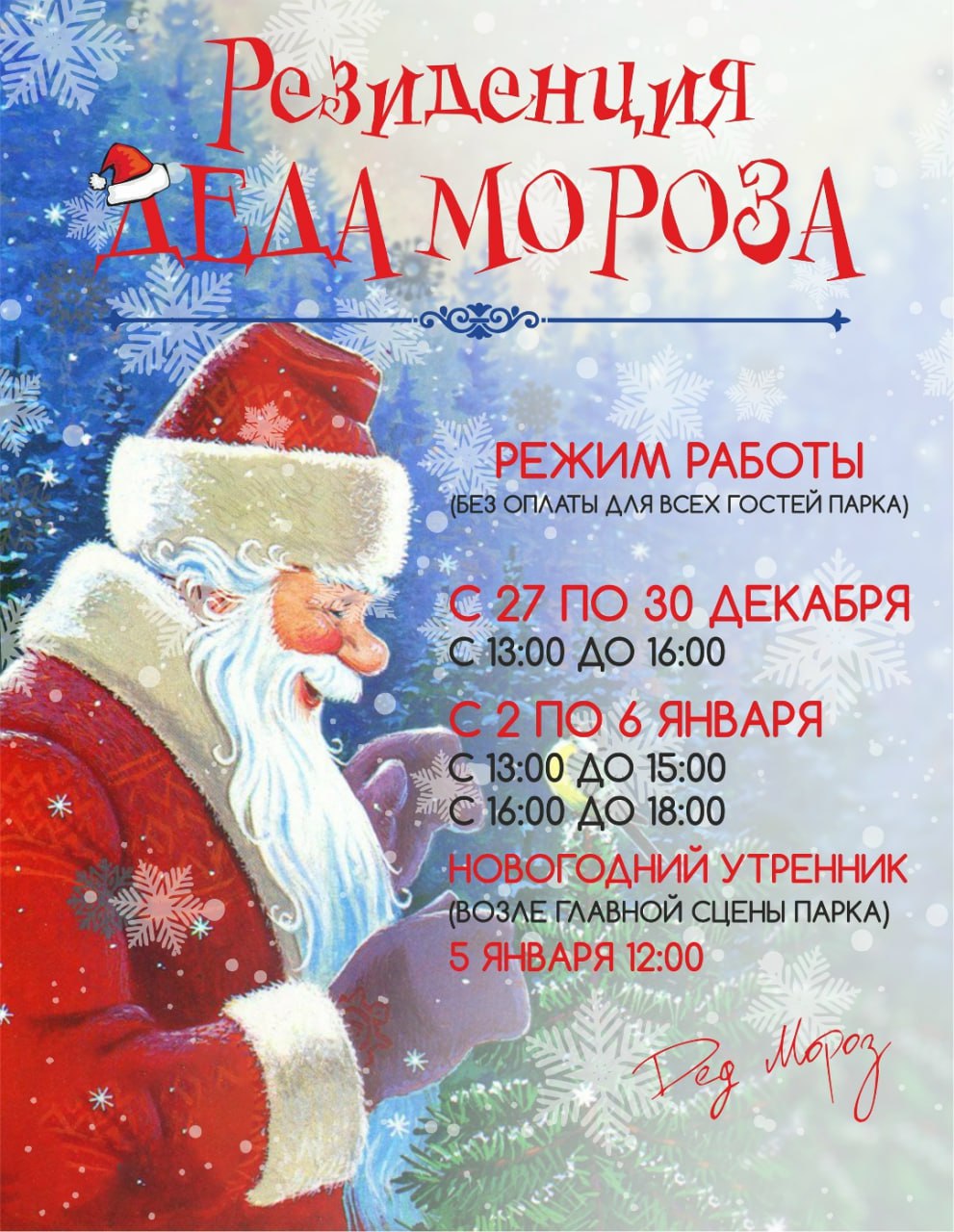 А 5 января Дед Мороз устраивает новогодний утренник возле главной сцены парка. Начало мероприятия в 12:00.