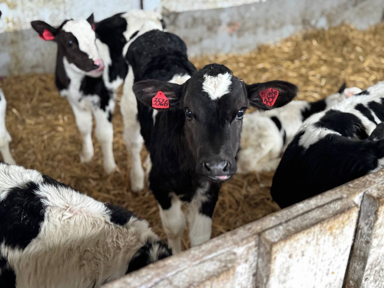 На одной из местных ферм кипит работа, а эти пятнистые малыши — её главные и самые очаровательные герои. Кажется, теленок с номером 3526 явно позировал нашему оператору.