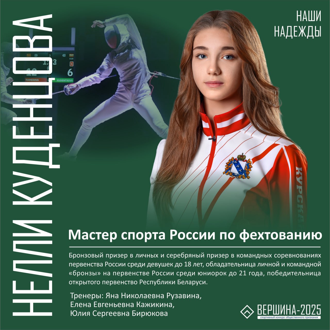Рассказываем о сильнейших молодых курских спортсменах, которые были отмечены наградами областной премии общественного признания «Вершина». В этом году в списке лучших 15 чемпионов по 10 видам спорта: фехтованию, боксу, тяжелой атлетике, всестилевому каратэ, легкой атлетике, шахматам, дзюдо, конному спорту, баскетболу и танцевальному спорту. Публикуем первую часть карточек Минспорта Курской области. #спорт46