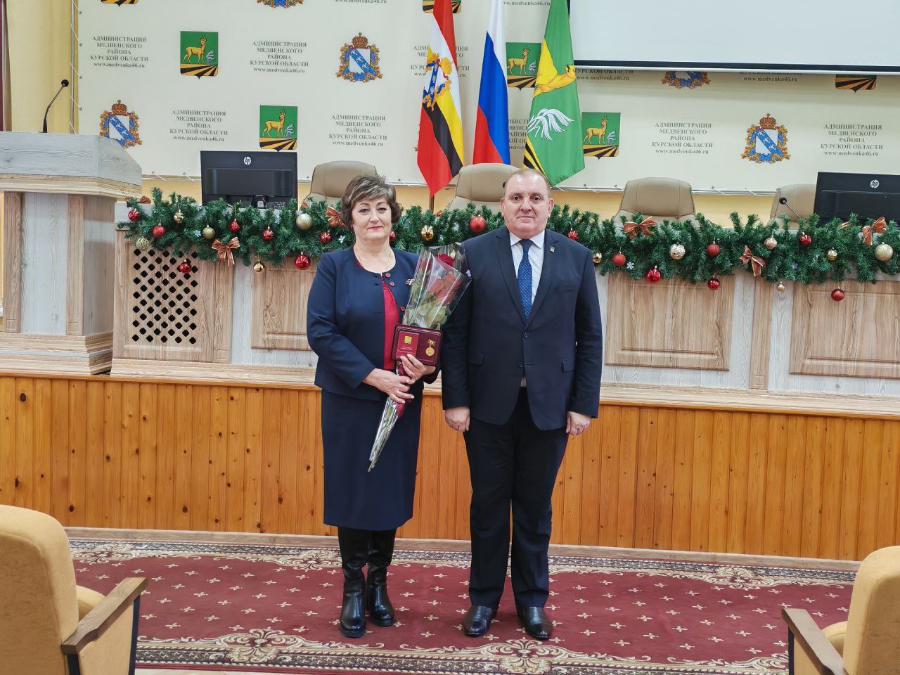 Сегодня на оперативном совещании вручил медаль "За заслуги перед Медвенским районом" Марии Дмитриевне Кузьминой, директору Комплексного центра социального обслуживания населения Медвенского района