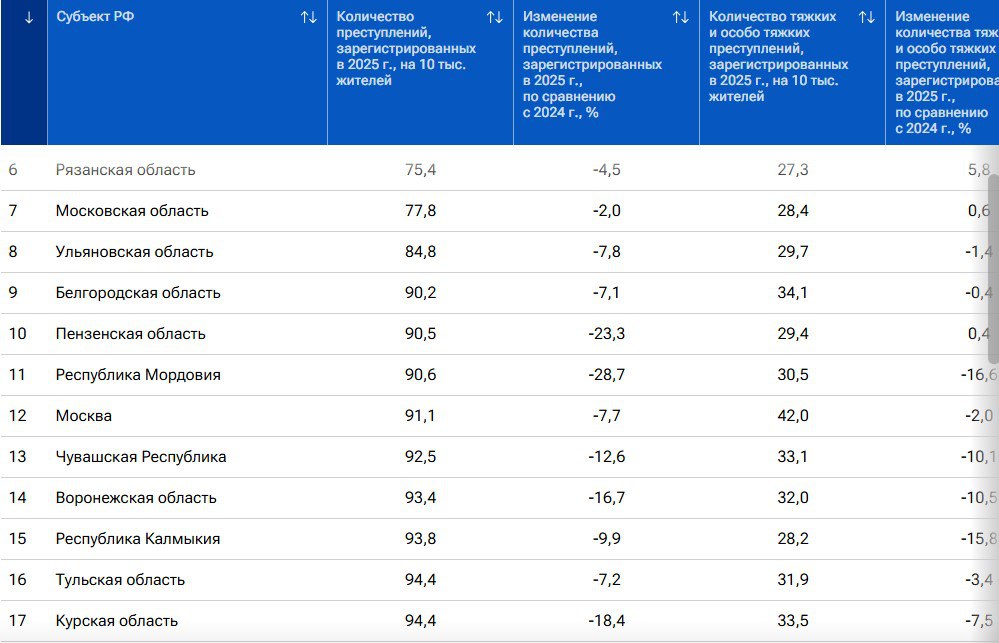 Курская область заняла 17-е место в общероссийском рейтинге регионов по уровню преступности, составленном экспертами РИА Рейтинг на основе данных МВД России за 2025 год. В прошлом году в регионе было зарегистрировано 94,4 преступления на 10 тысяч жителей. Этот показатель демонстрирует значительное улучшение, снизившись на 18,4% по сравнению с 2024 годом. Также в области сократилось количество тяжких и особо тяжких преступлений — на 7,5%, до 33,5 случаев на 10 тысяч человек, что ниже среднероссийского уровня.