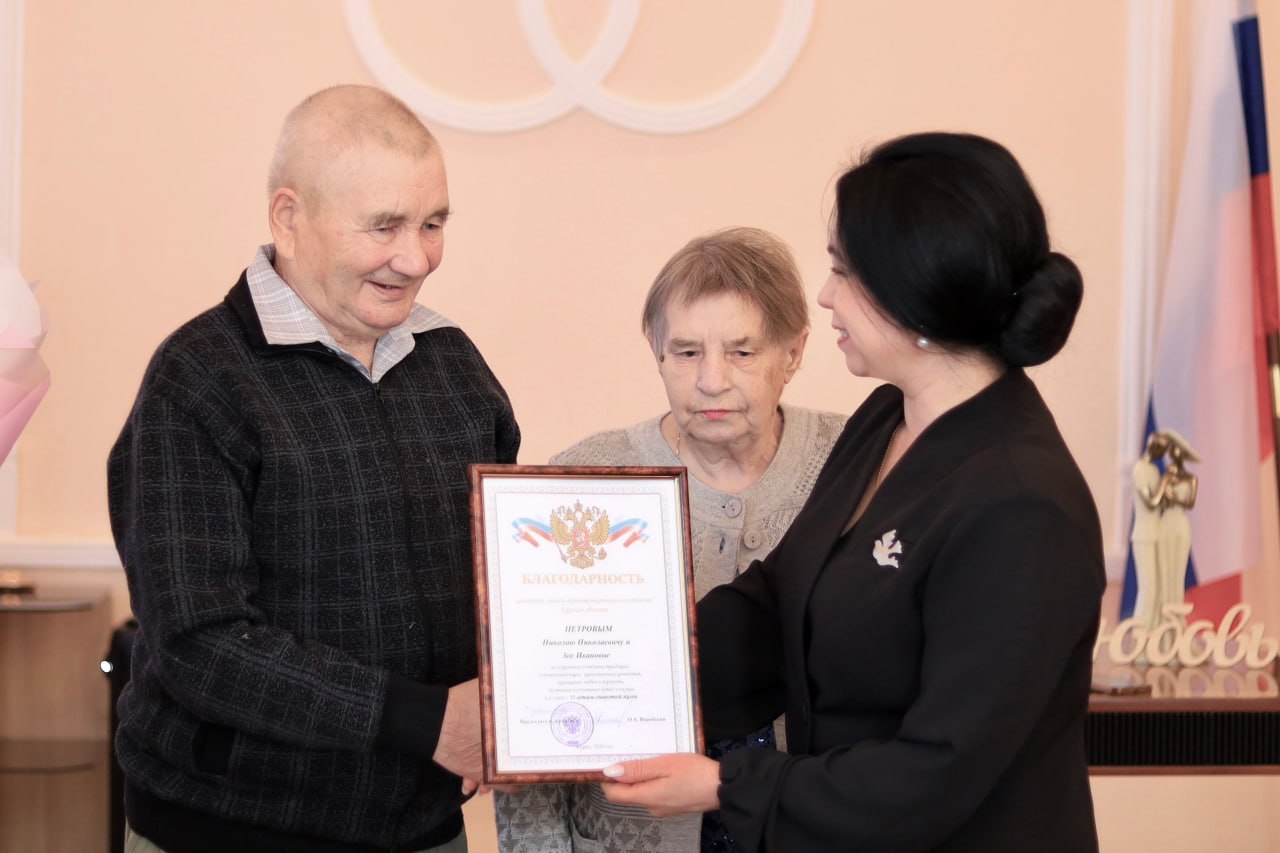 Семья Петровых — Николай Николаевич и Зоя Ивановна — отметила изумрудную свадьбу, 55 лет вместе. Их уважение в районе заслужено не только годами брака, но и достойным воспитанием детей, вниманием к внукам и правнукам: сейчас в их большой дружной семье — четыре внука и двое правнуков. Петровы собираются вместе, передают молодым свой жизненный опыт и учат, что семейные узы крепнут в простых, но важных вещах — любить друг друга, поддерживать и иметь позитивный взгляд на жизнь.