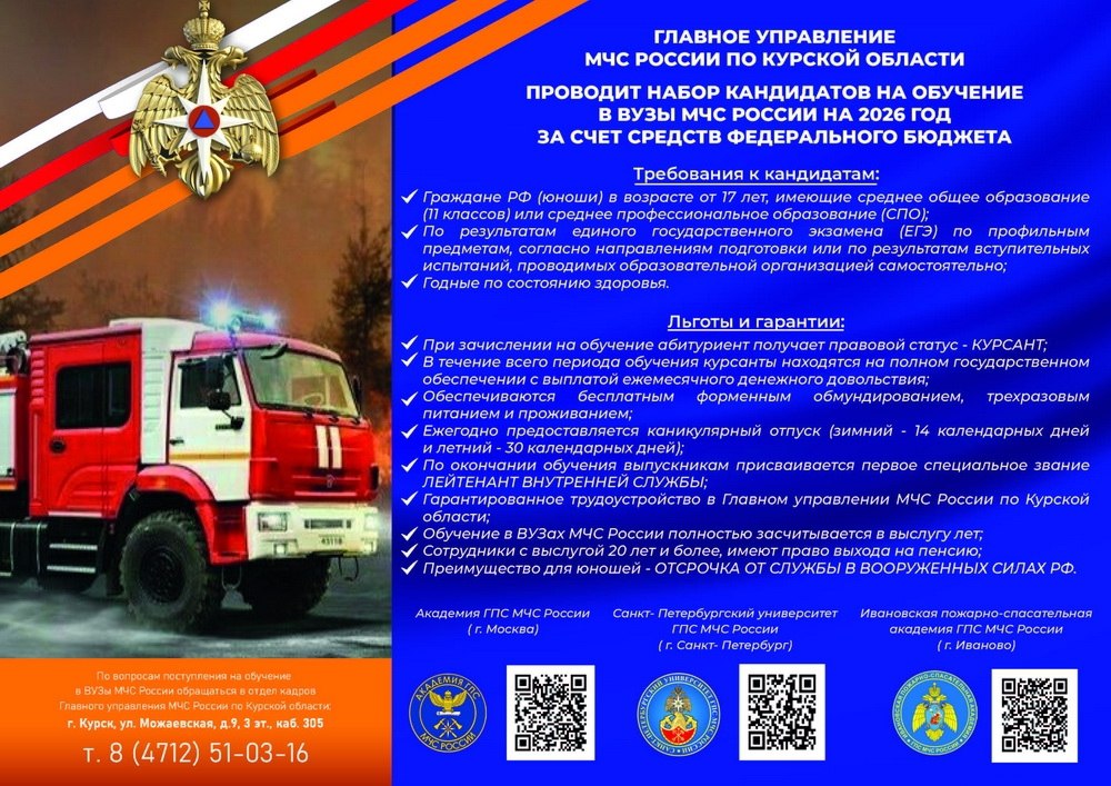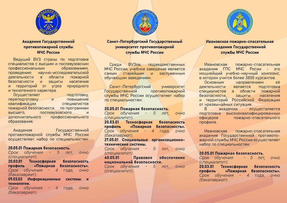 МЧС России ежегодно готовит специалистов для службы в различных субъектах Российской Федерации. Подготовка проходит в учебных заведениях высшего образования МЧС России.